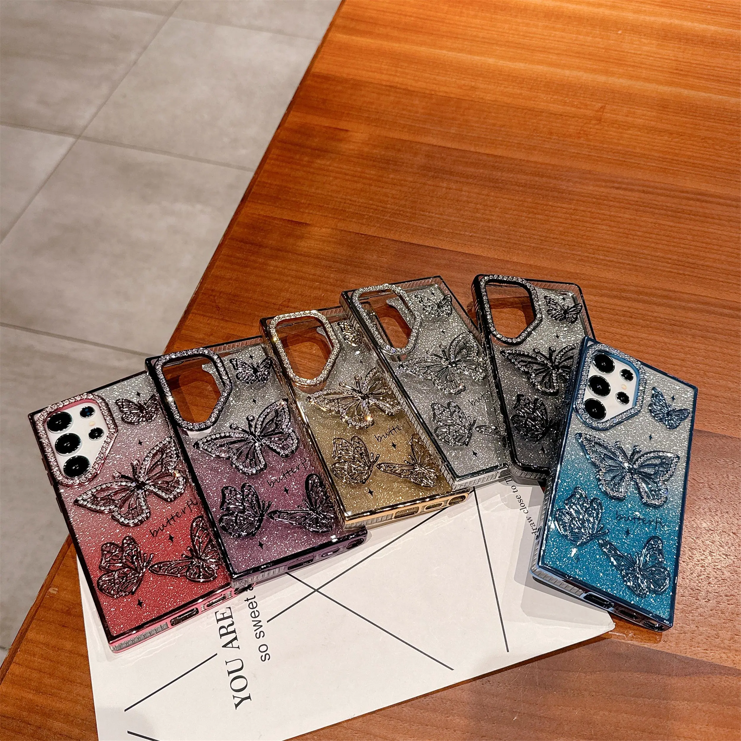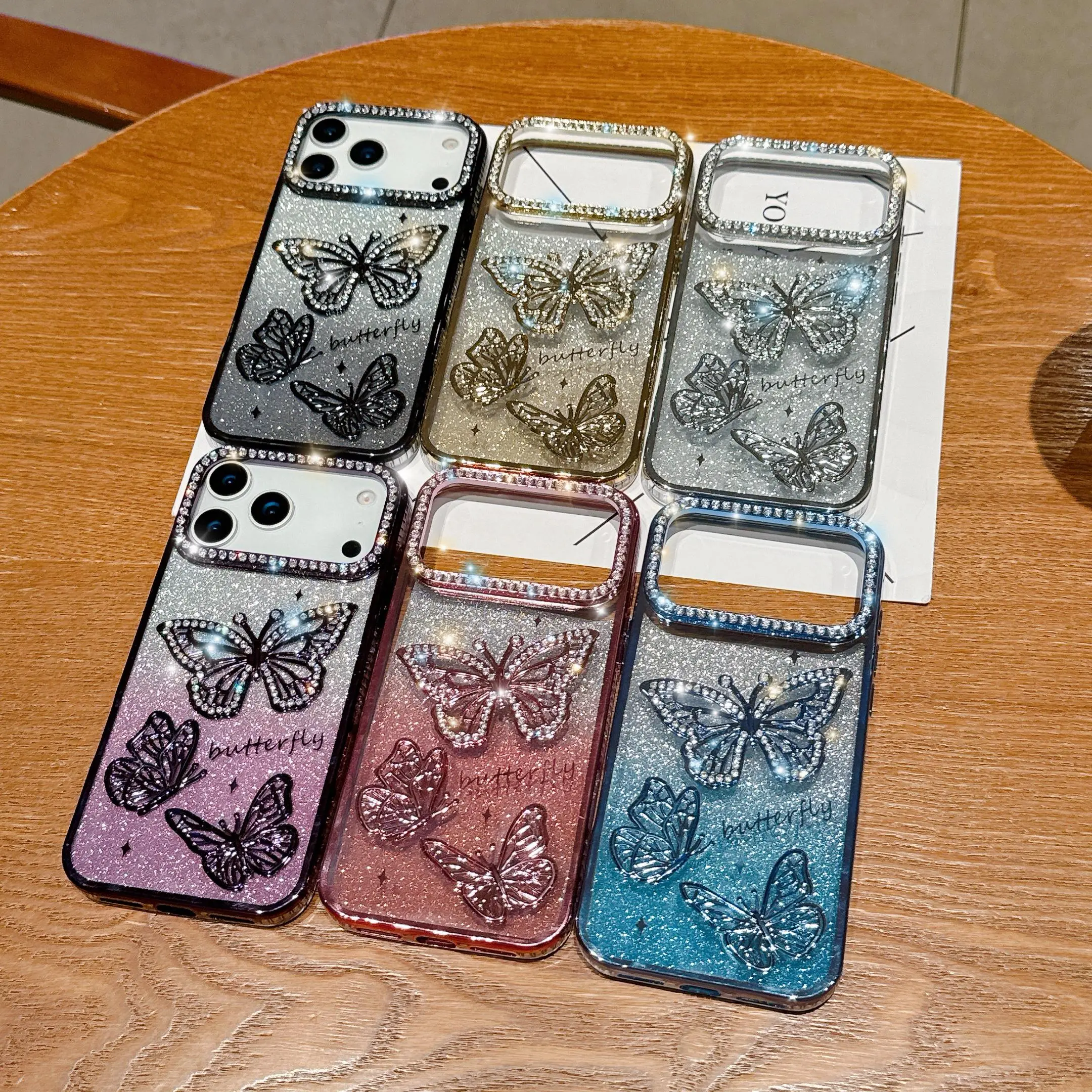 3D Inlaid Rhinestone Butterfly Phone Case – Compatible with iPhone 17/16/15/14/13/12 | Gradient Glitter Electroplated Finish, Transparent Full-Cover Soft Silicone, 3D Inlaid Rhinestone Protective Case