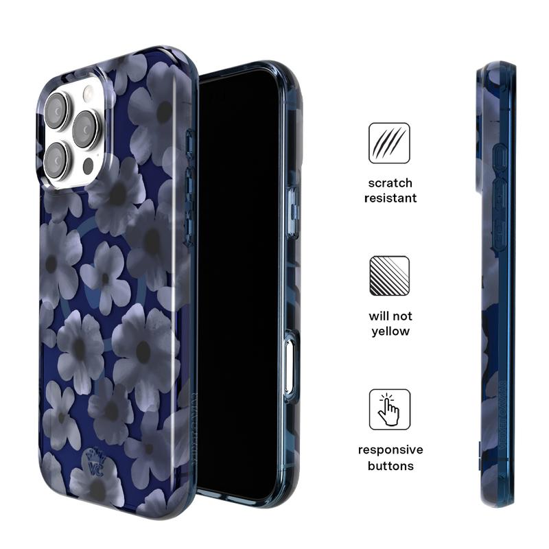 Ever wish your phone case could be both cute and tough? Meet the Velvet Caviar Midnight Blossom case, designed to bring a stylish 90s floral vibe to your iPhone while keeping it safe. This translucent navy case features hand-drawn grey-tone blossoms that add a girly yet trendy touch, perfect for anyone who loves fashion-forward accessories. Crafted with FirmFlex technology, it combines a soft TPU bumper and hard PC plate to protect your phone from drops up to 10 feet. Plus, raised bezels shield your screen and camera from scratches. Compatible with a wide range of iPhone models—from 12 to 16 series, including Pro and Max—you can easily customize it with magnetic grips or wallets. Just remember, charging is via USB-C cable since it doesn't support MagSafe chargers or battery packs. Designed by artists in NYC since 2014, this case blends premium quality materials with laser printing for a vivid, scratch-resistant finish. Whether you're heading out for a night on the town or just want everyday protection with style, this case has got your back. Grab yours now and give your iPhone the cute, protective upgrade it deserves!