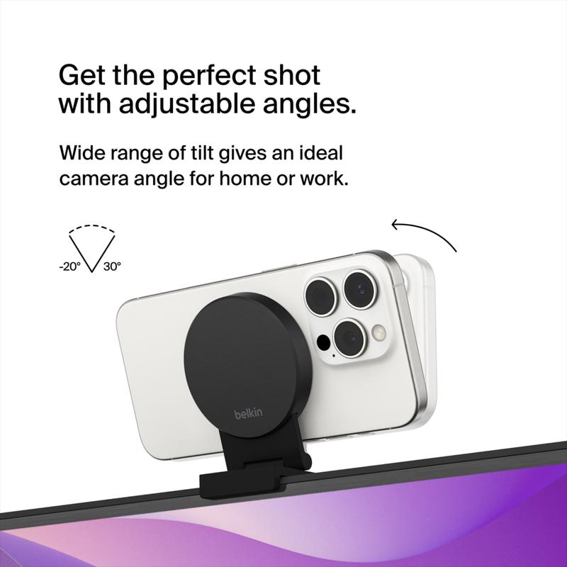 "Belkin Stage iPhone Continuity Camera Mount, MagSafe Magnetic Connection, iPhone into Webcam, iPhone 12 or Later, Conference Calls, Facetime Sessions, Content Creation, for Apple TV 4K & TV's Displays up to 4"" Depth, Tilt from -20 to + 30 Degrees."