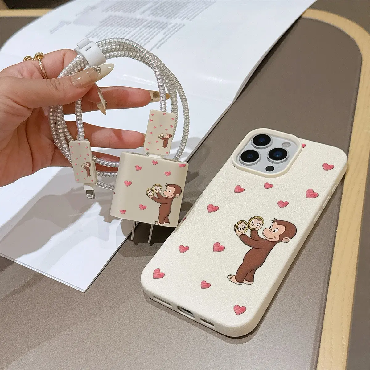 6-Piece Set Creative Heart Monkey Phone Case, Charging Head Cover, Cable Protector, Storage Rope, Data Line Protection for iPhone