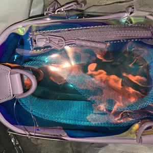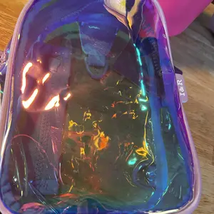 Made with a high-shine, iridescent fabric, each backpack reflects a stunning mix of purples, blues, greens, and golden tones.