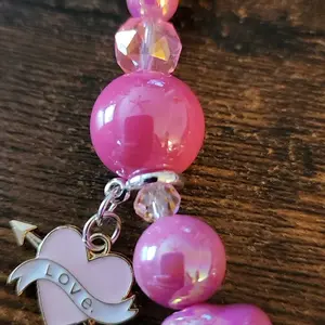 Super super cute item, the color is beautiful. The pink is so sparkly. And it fits perfect on my wrist.