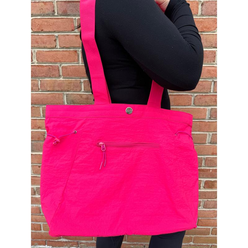 Lightweight, very spacious, and a beautiful shade of pink tote. Highly recommend this if you like a lot of room, but still like the lightweight bags/totes.
