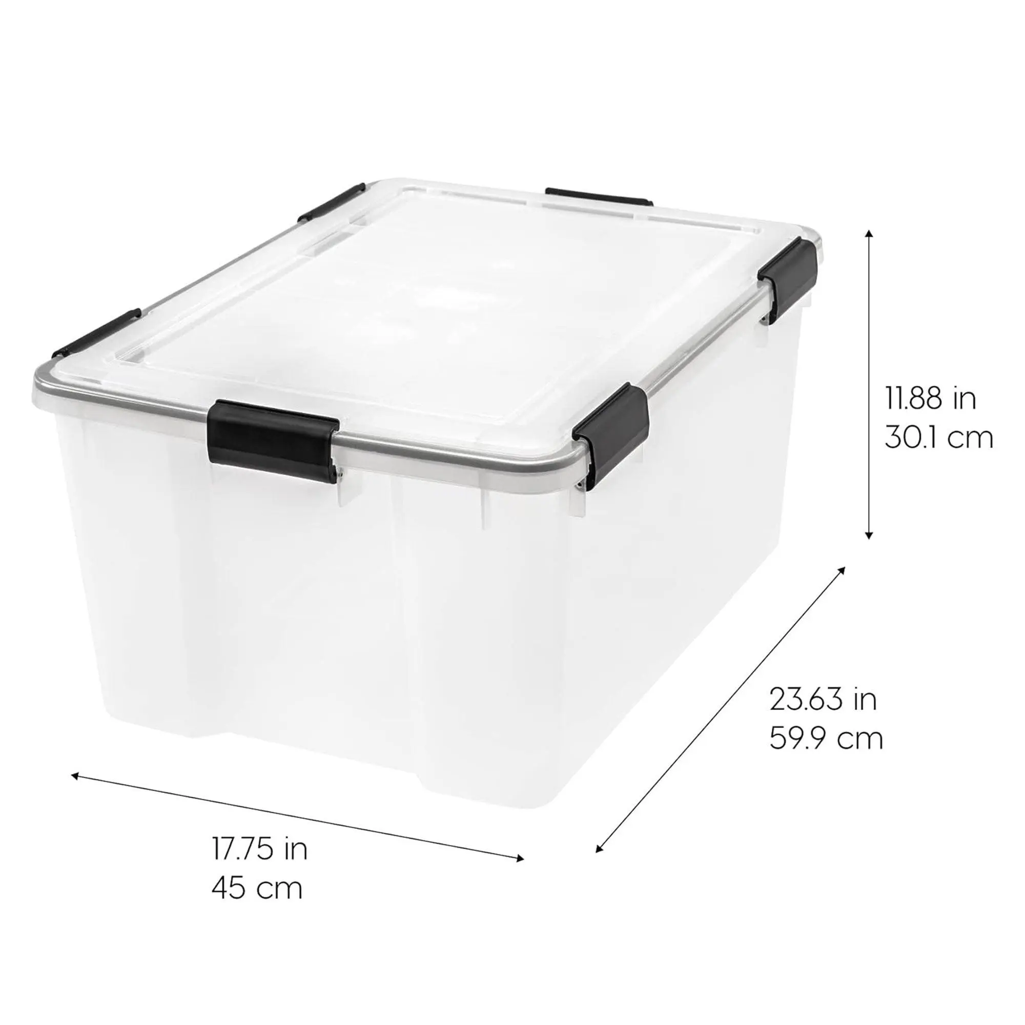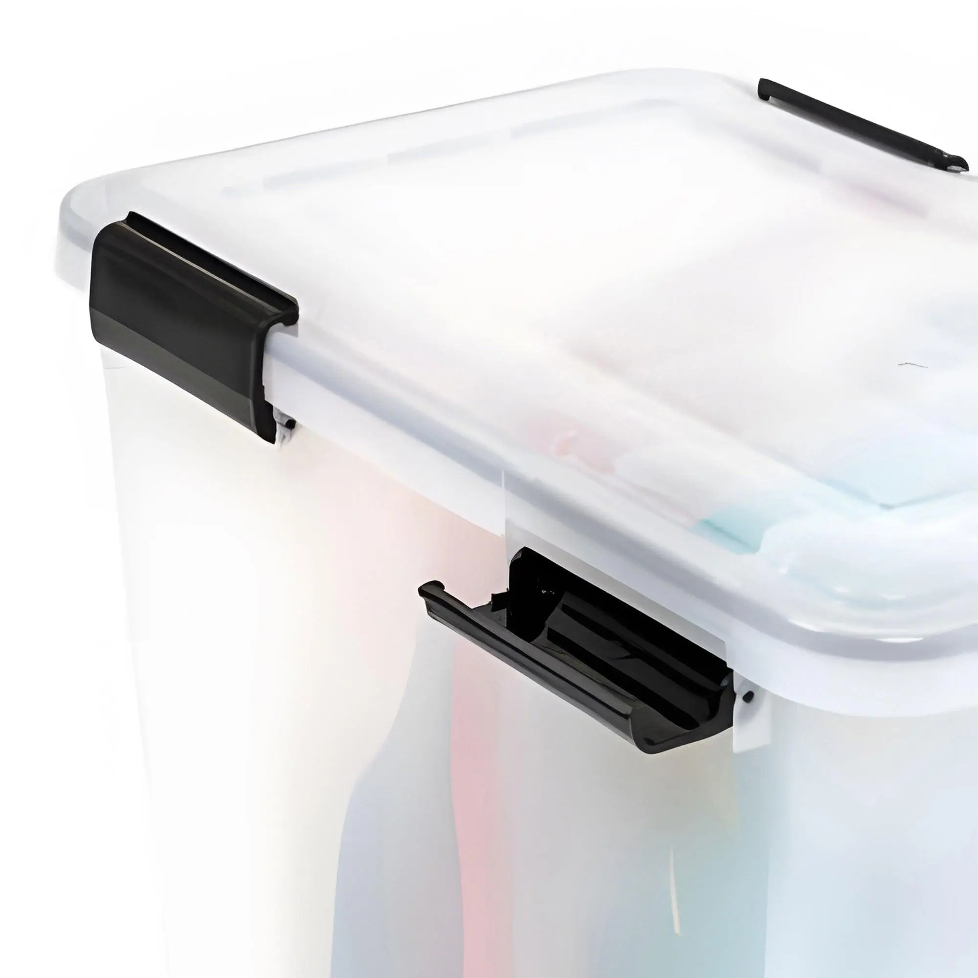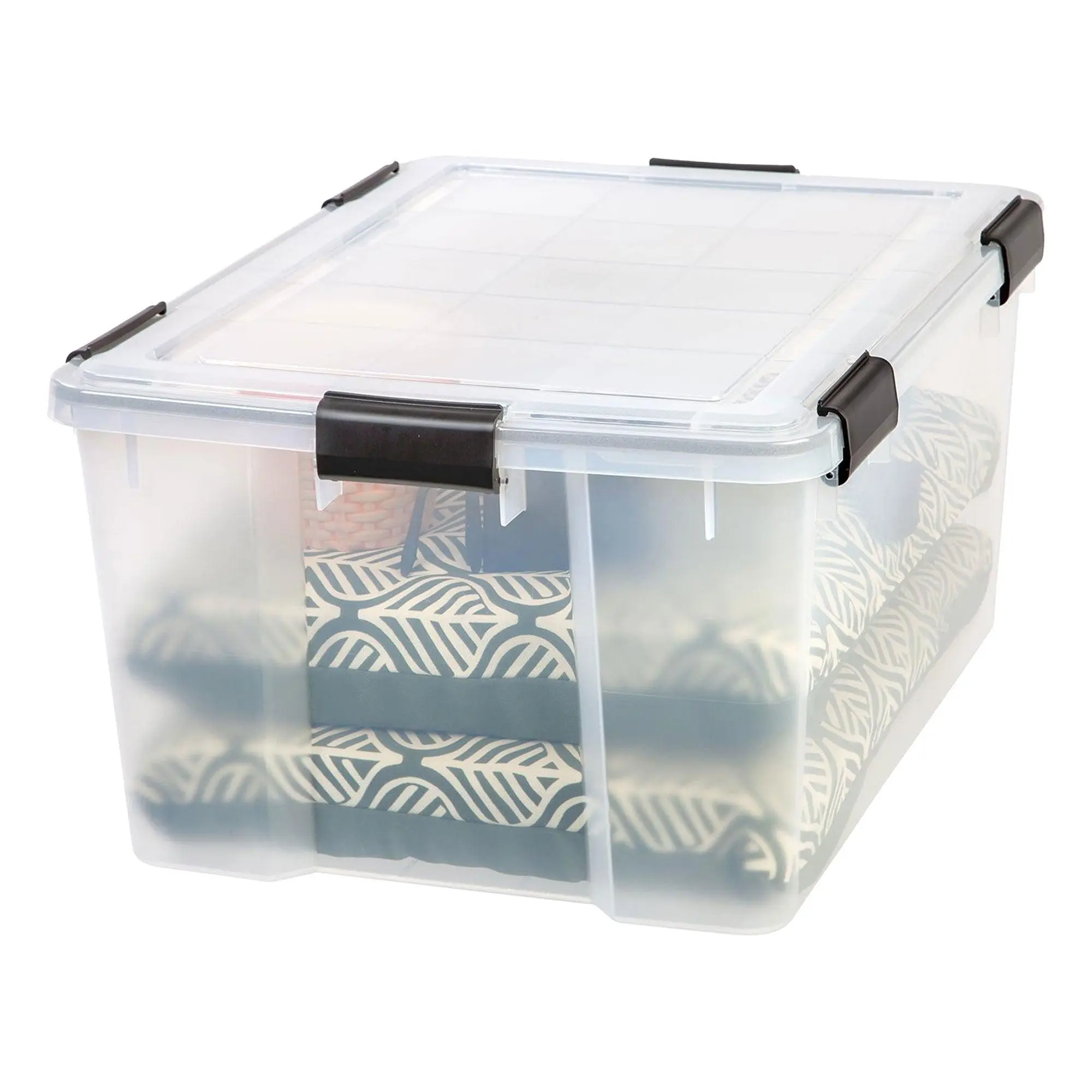 Take control of your space with IRIS USA's WEATHERPRO storage containers. Made in the USA with durable materials, these bins feature gasket seals that keep your belongings fresh and protected from moisture and dust. The multi-buckle latching system secures the lid, making these bins perfect for storing documents, food, clothes, and outdoor gear. Grooved lids and bodies allow stable stacking for easy organization at home or on the go. BPA-free and acid-free for your piece of mind. When not in use, their tapered design allows for compact nesting. Simplify your life with IRIS USA's WEATHERPRO containers!