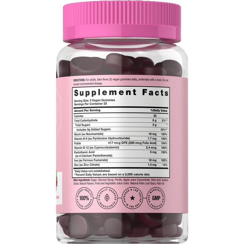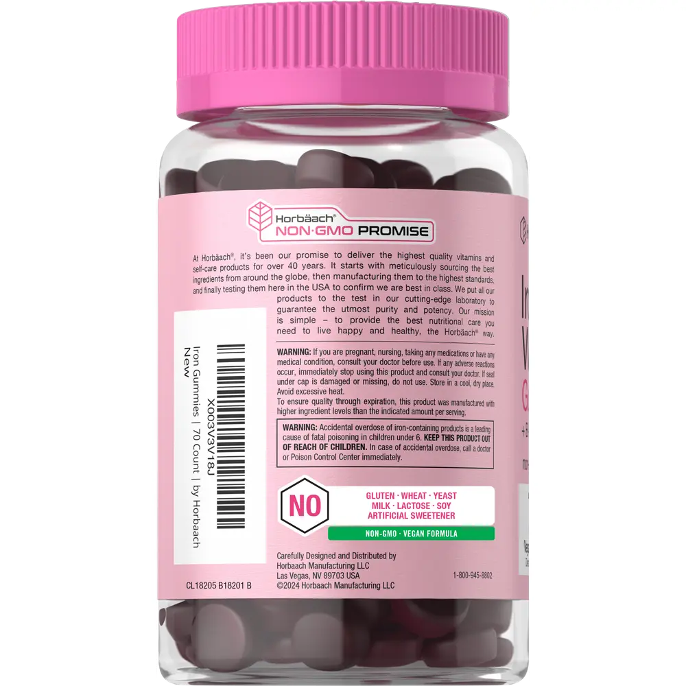 Boost your routine with Horbaach Iron for Women Gummies! This highly innovative formula, designed specifically for women, provides 18 mg of Iron, along with essential B-Vitamins like B6, B12, and more, in delicious grape flavor. Our vegan gummies are gluten free and non-GMO made with no artificial sweetener, delivering just what you need to help meet your supplement goals.