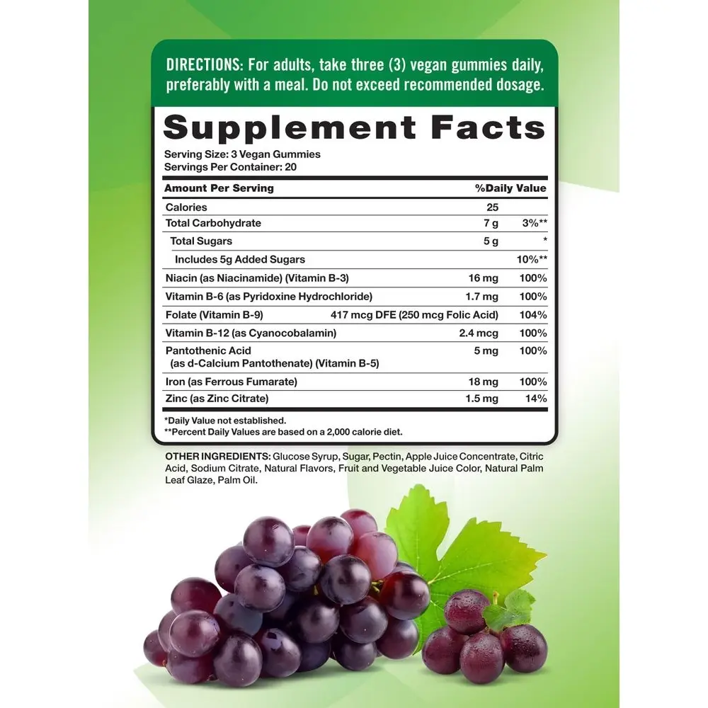 Our Iron Gummies offer a delicious way for men and women to add essential Iron into their daily routine. Each serving provides 18 mg of Iron, which meets the daily recommended value, plus B-Vitamins (including B-3, B-5, B-6, B-9, and B-12) and Zinc for additional support. These gummies are a tasty grape flavor and vegan friendly – making them an absolute pleasure to take.