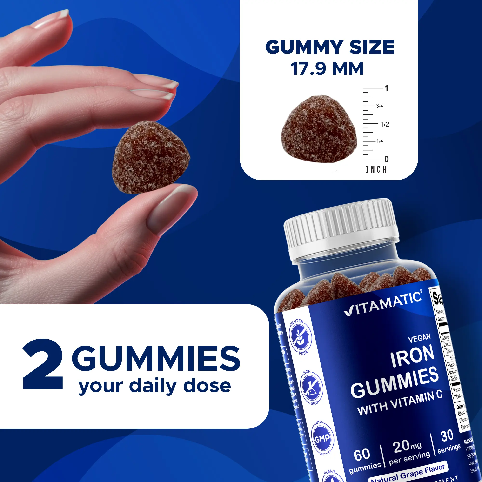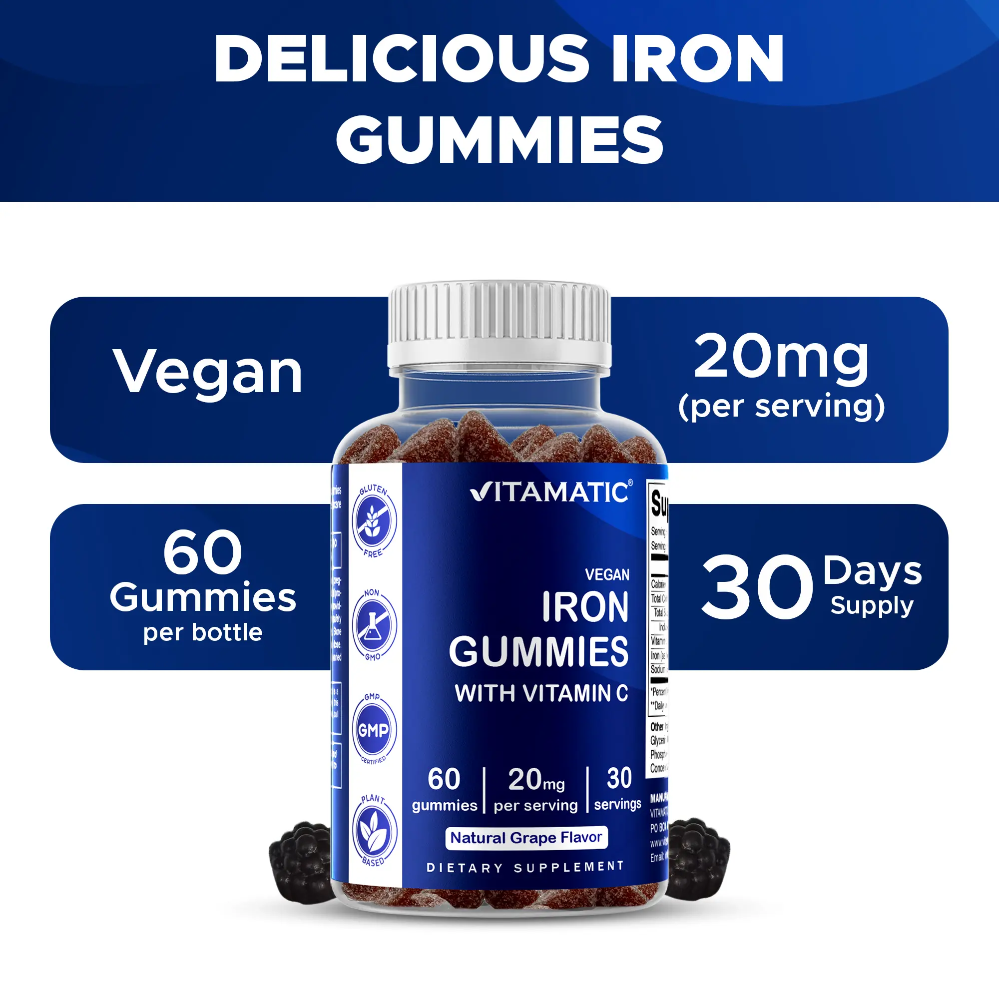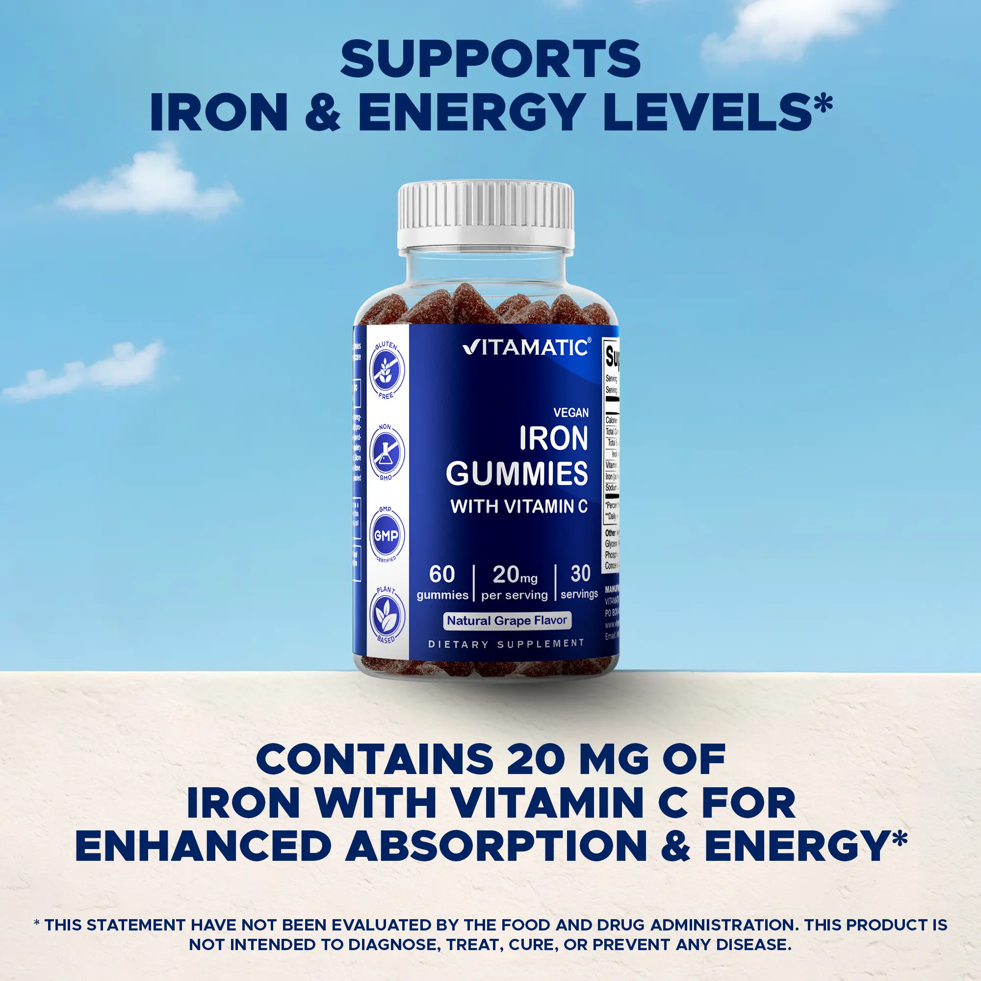Iron comes in various forms. Gummies are the most pleasant tasting formula, delivering 20 mg per daily serving. Each bottle contains 60 vegan gummies.