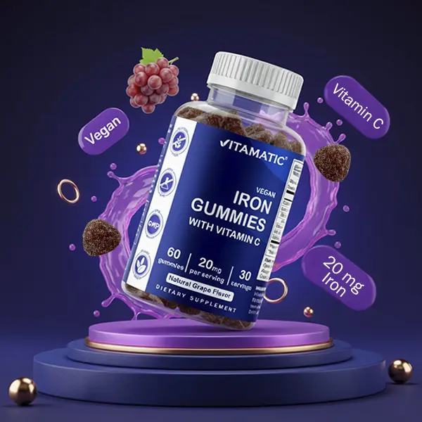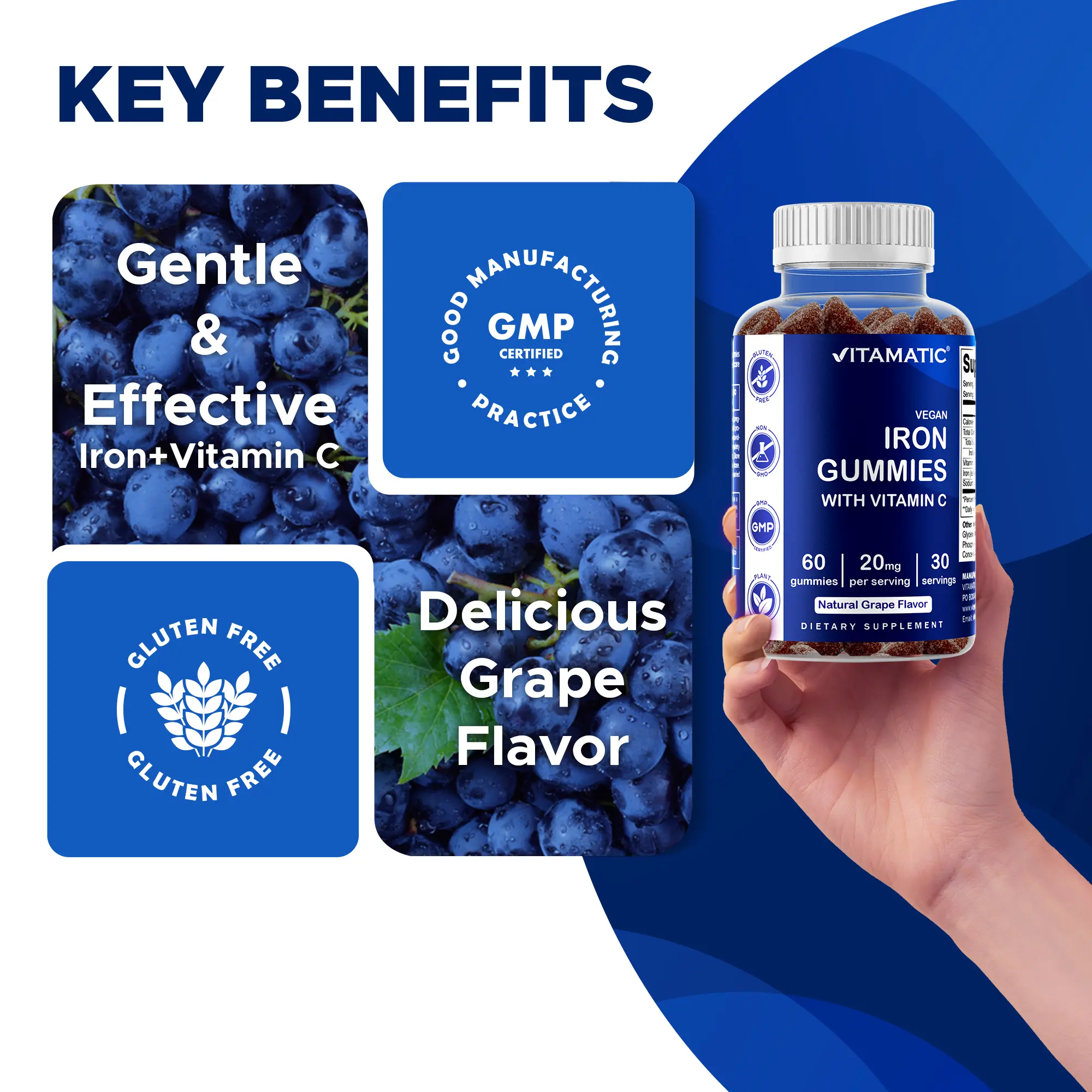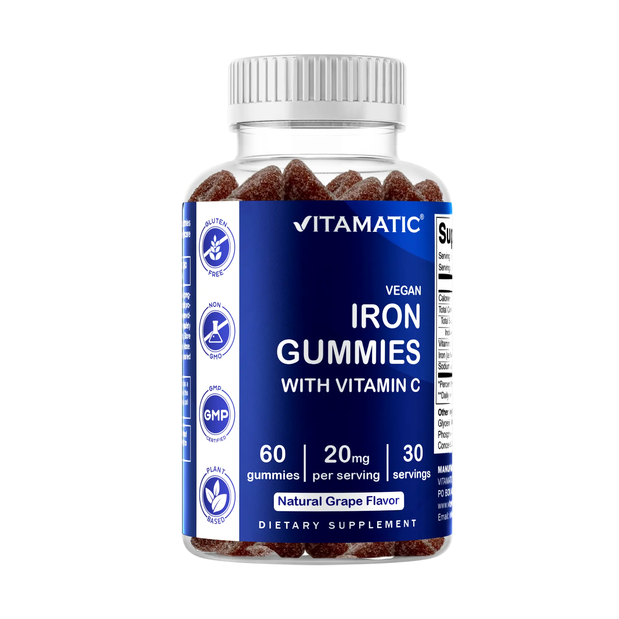 Vitamatic Iron Gummies offer a delightful natural grape flavor. Avoid large iron capsules, tablets, or pills that leave an unpleasant aftertaste and are difficult to swallow. These gummies provide a pleasant alternative for iron supplementation.