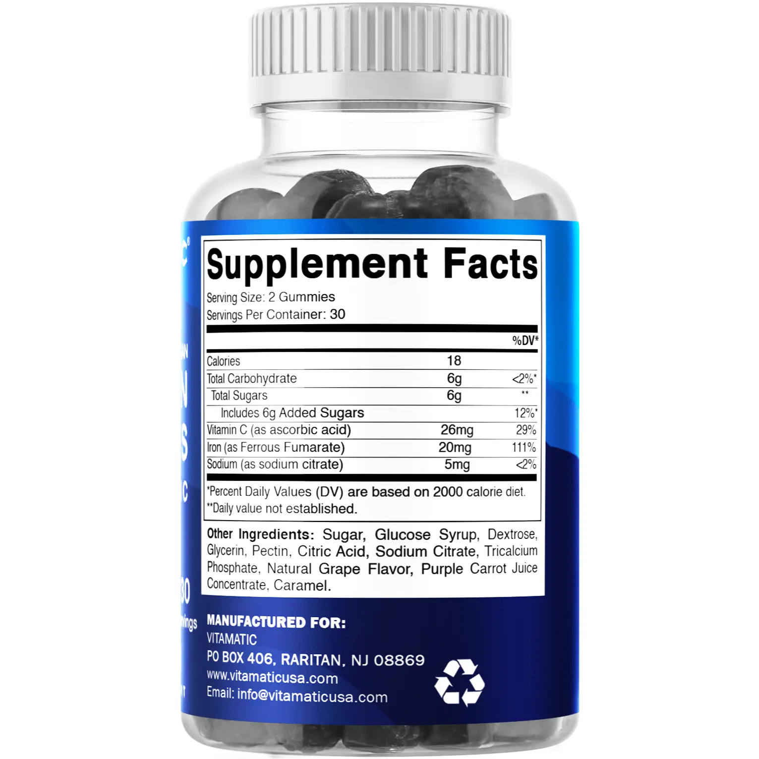 Each serving contains 20mg of iron and 26mg of vitamin C. These gummies support red blood cell formation and energy levels. They are a great iron supplement for anemia. The combination of iron and vitamin C aids in better absorption.