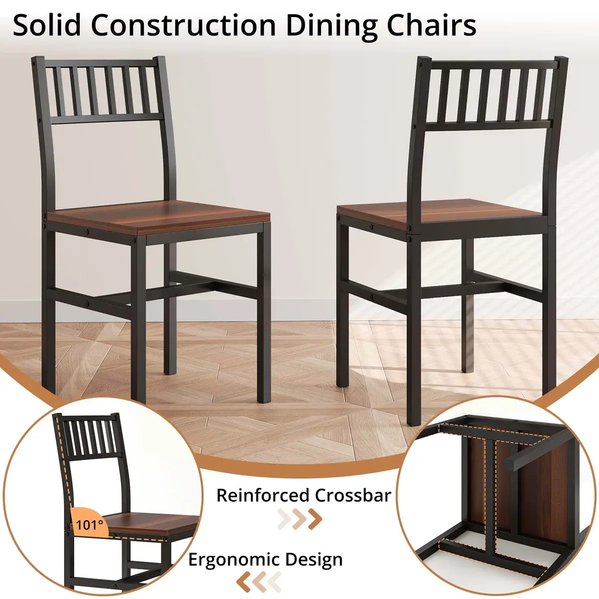 Ergonomical Dining Chairs: Two durable metal frame dining chairs complete the set. The ergonomic design with slightly curved seat back provide comfortable sitting experience, while the sleek metal frames add a robust and modern touch.