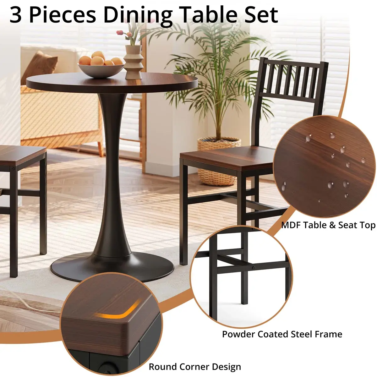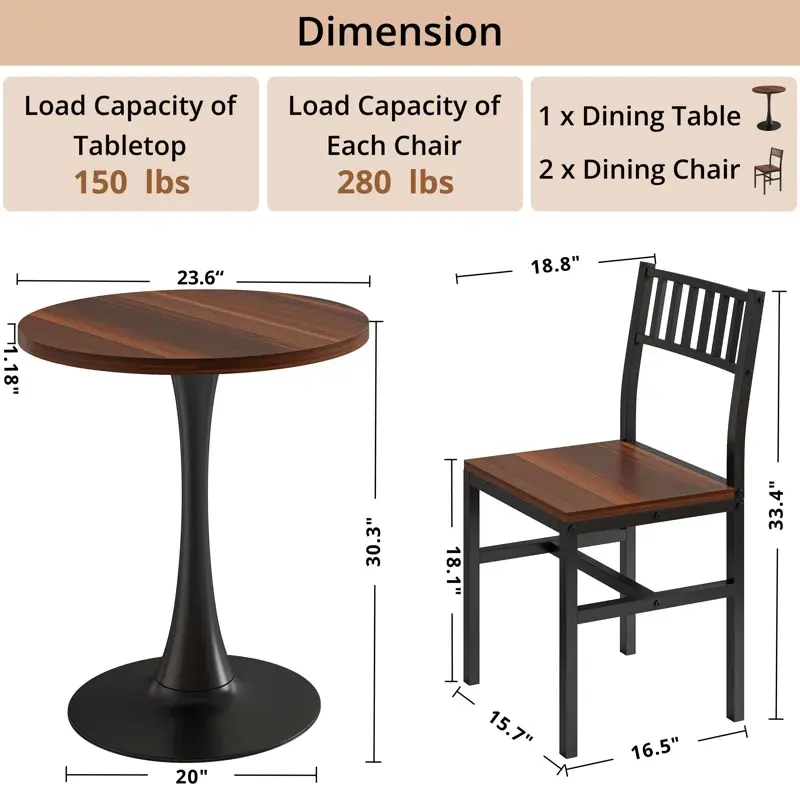 Compact and Versatile: The compact size of the round table makes it ideal for small apartments, cozy kitchens, or any space where efficiency is key. The 3-Piece Dining Set is versatile enough to fit your home kitchen and dining room, while also a great choice for some commercial spaces like restaurant, coffee shop and pub.