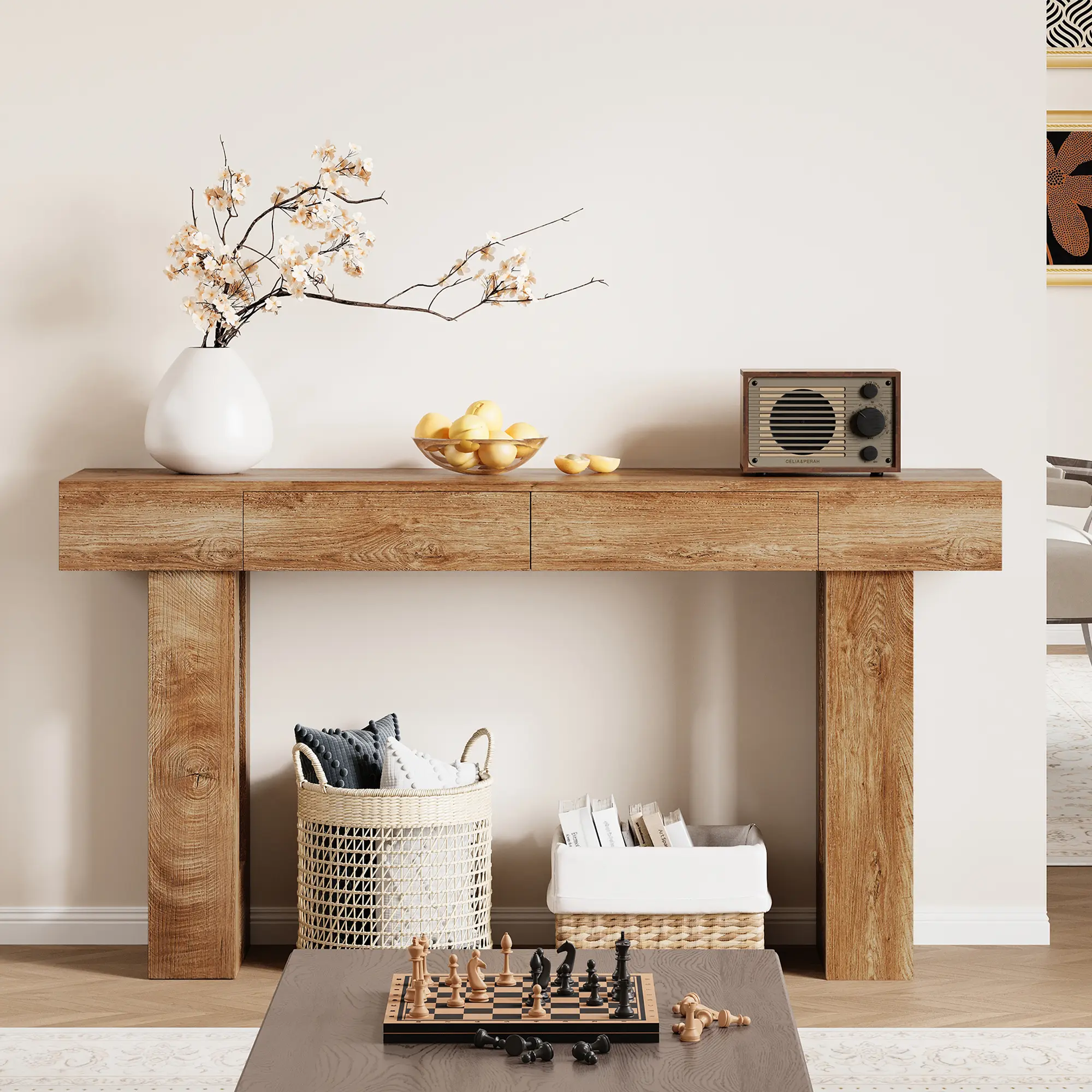 Spacious Tabletop: With a length of 63 inches, this console table offers an expansive surface area, making it an ideal spot to display decorative items, potted plants, vase arrangements, family photos, or table lamps—keeping your space both stylish and organized.
