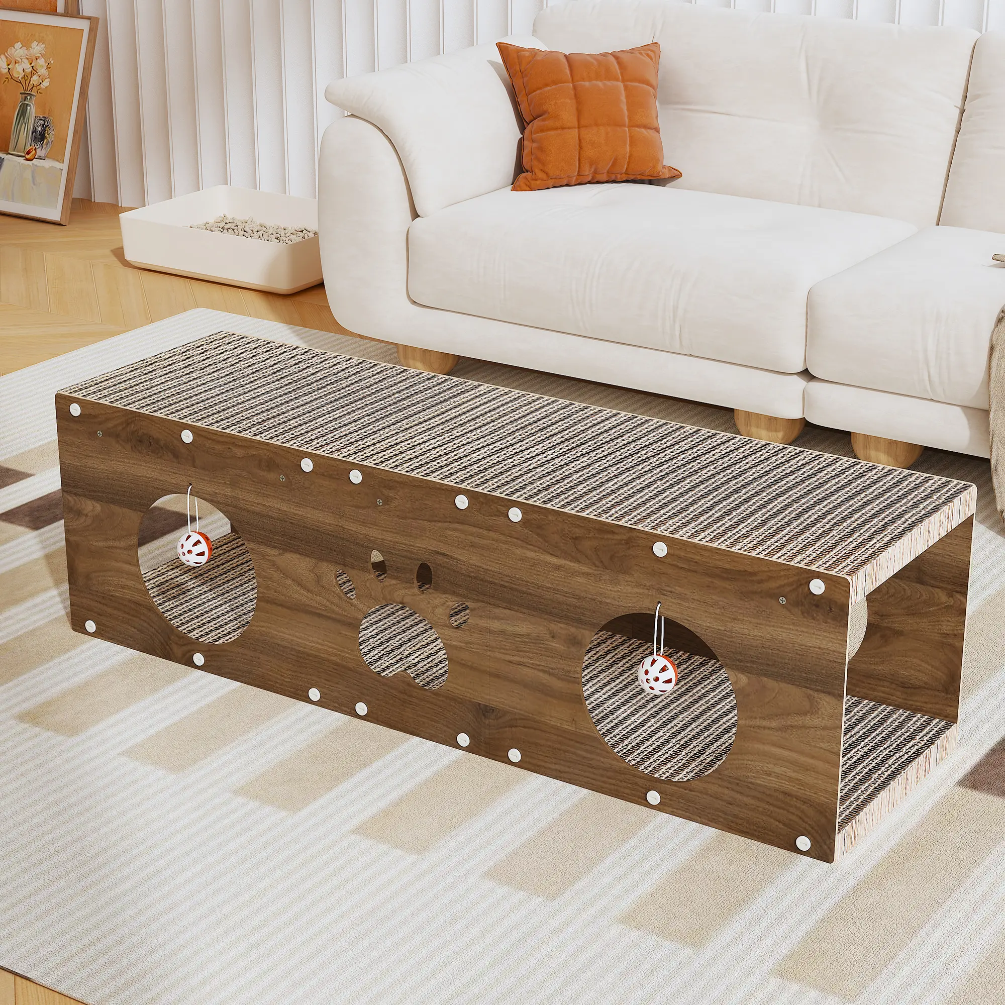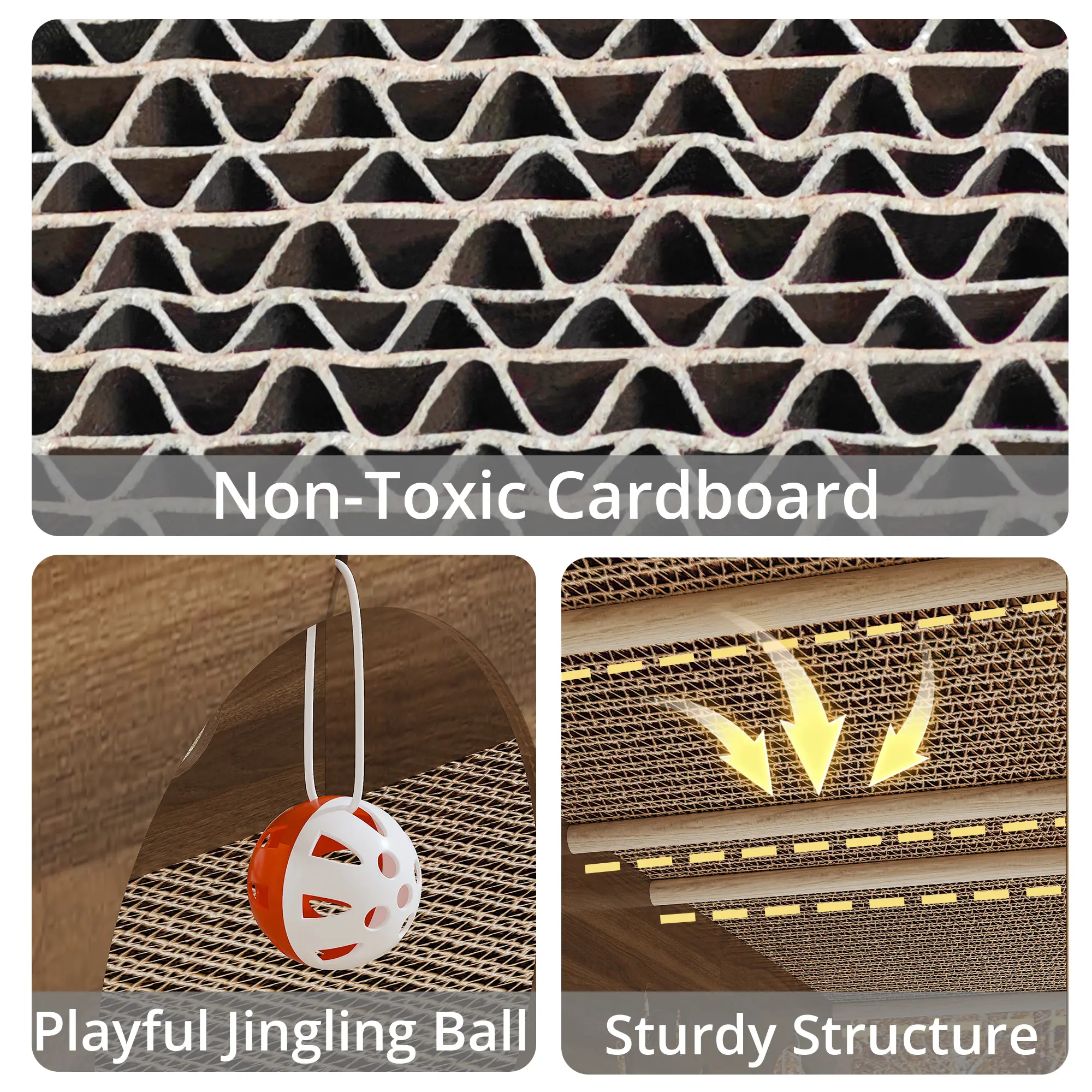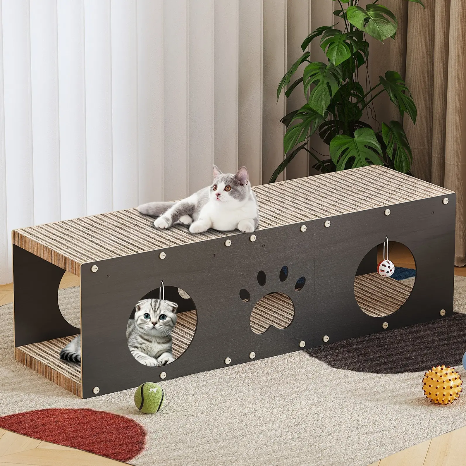 Multifunctional Fun Cat House: It can be used as a cat house, cat bed, cat scratching board, etc., providing a comfortable space for cats to play and rest. Two toy bell balls are also included.