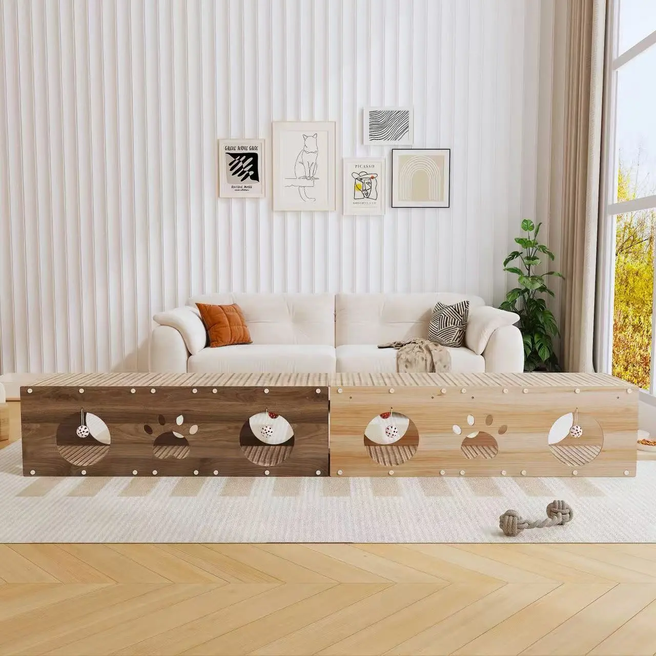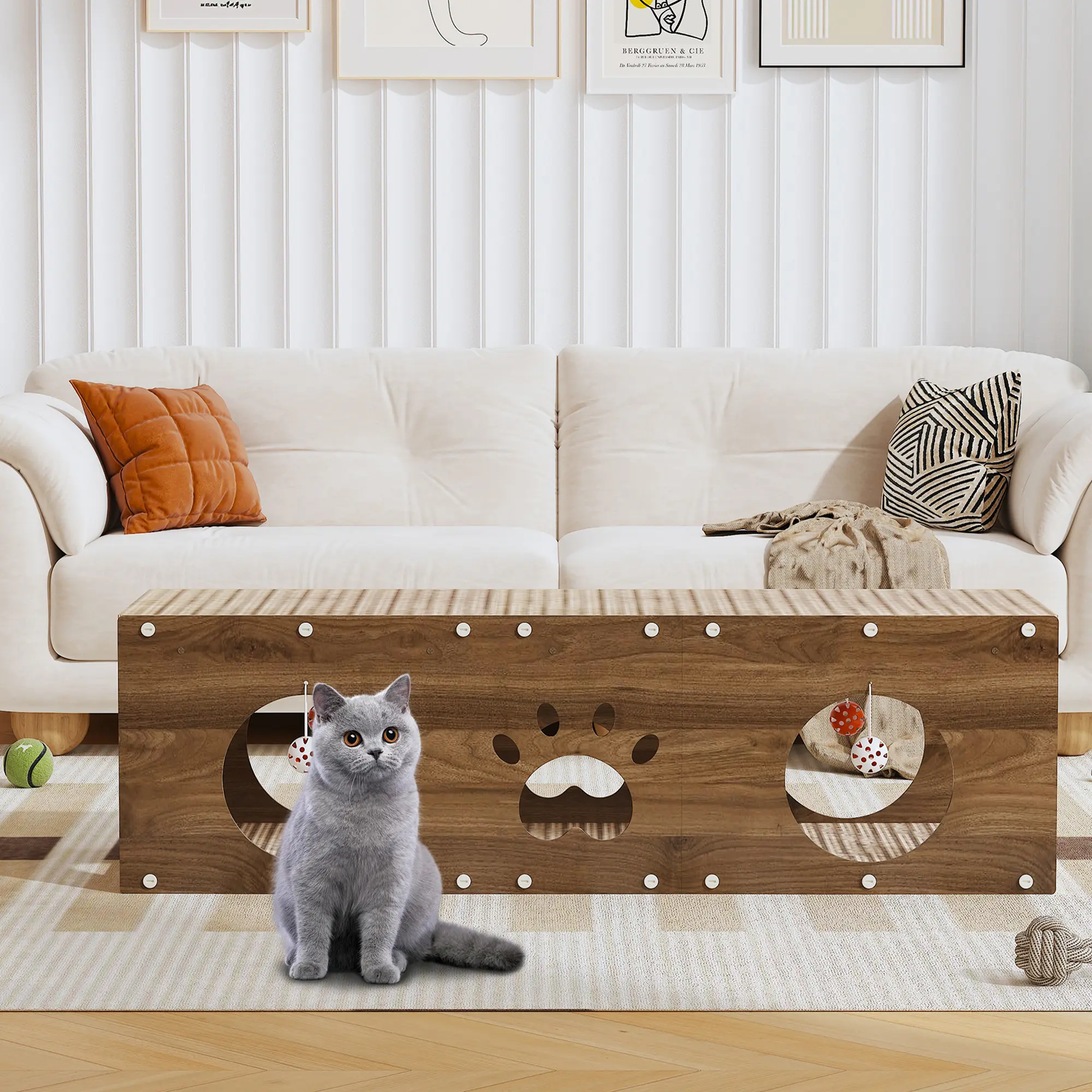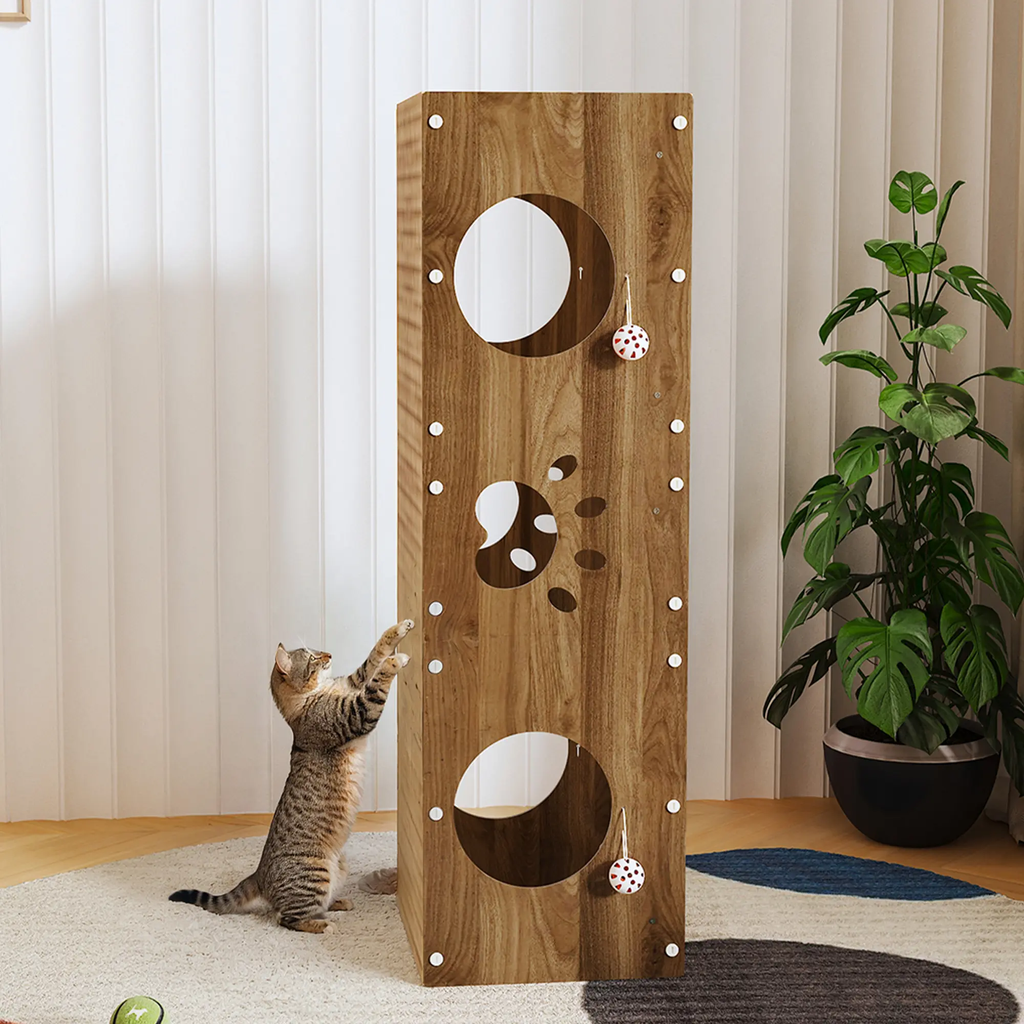Spacious & Sturdy Design: The interior offers a roomy area where cats of normal build can freely enter and exit. Please refer to the product size diagram for details. The top is supported by thickened solid wood pillars, allowing cats to safely run, jump, scratch, and nap without collapse - perfect for multi-cat households.