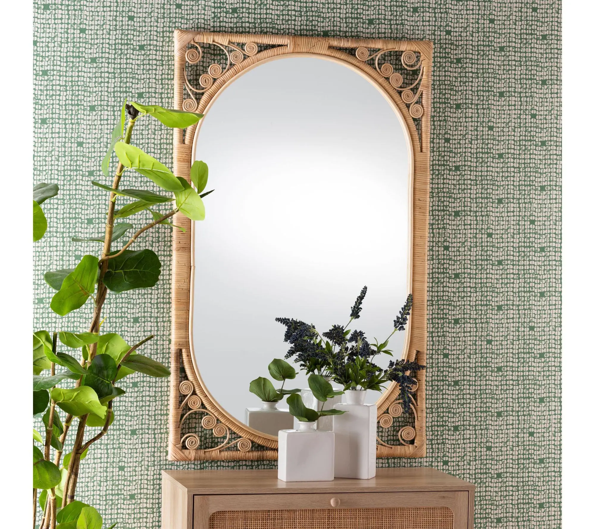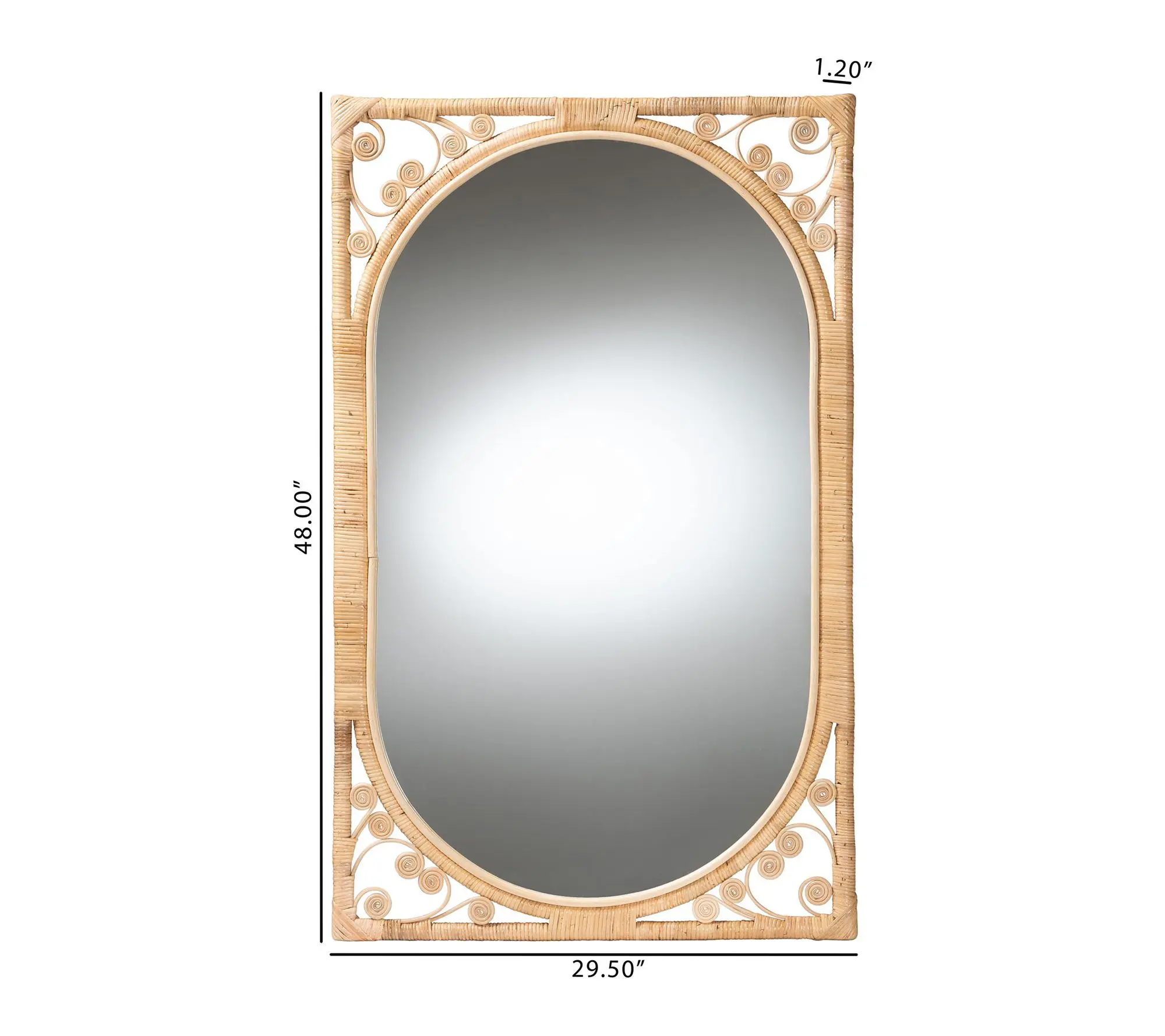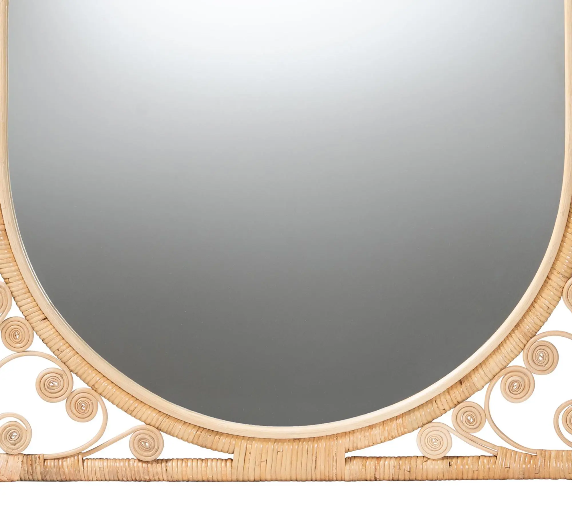 ·Handcrafted natural rattan frame with curled embellishments for visual texture