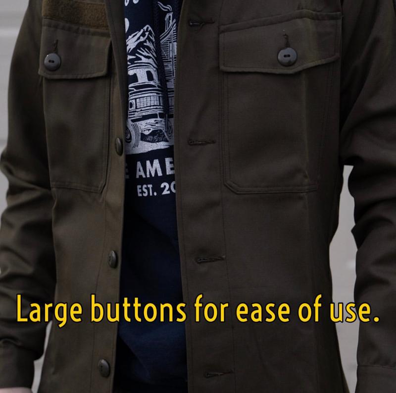The Austrian Field Shirt provides you with comfortable and durable work apparel. Large buttons enable you to undo them with gloves. Tough polsyester/cotton blend fabric in iconic Austrian RAL 7013 OD Green makes these shirts ideal for work, camping or simply looking cool. Most of these shirts will include velcro name patches.