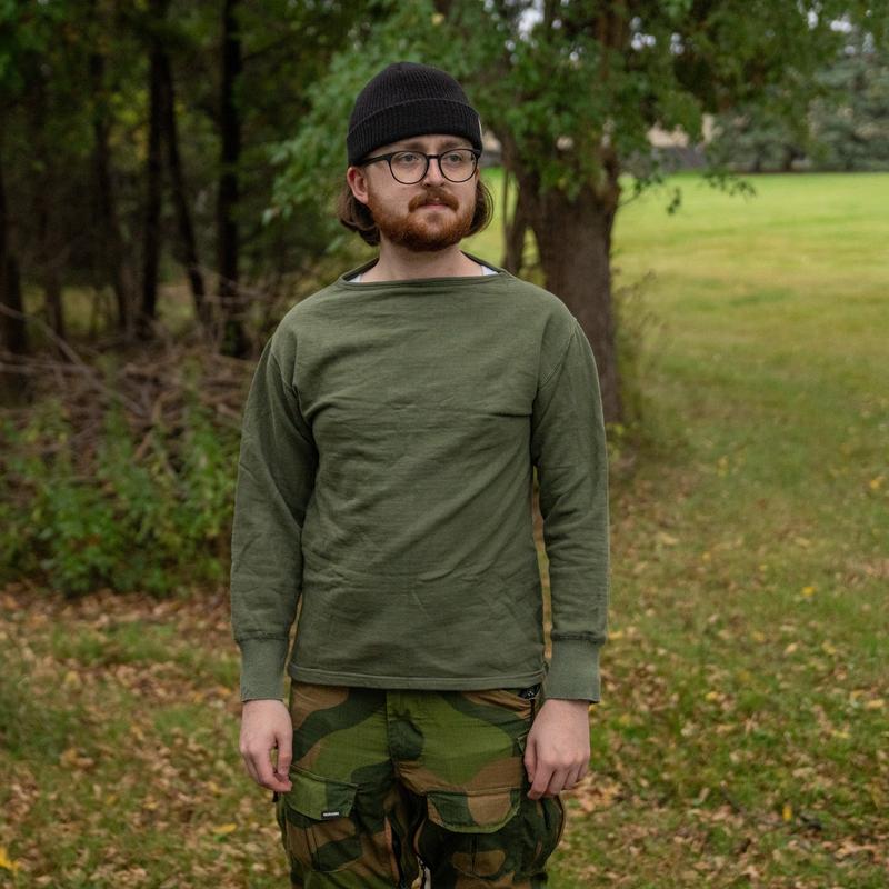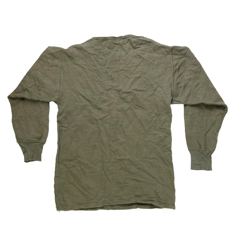 A comfy and inexpensive Greek sweatshirt or thermal undershirt. Comes in a simple olive drab colorway. Issued; Good condition. Extremely wide neck.