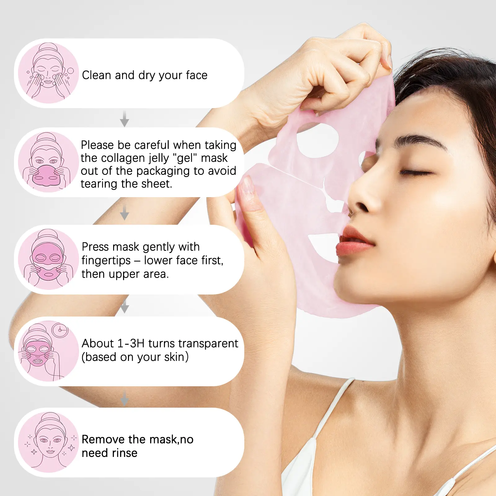 Become transparent: the mask gel material locks in moisture, apply for more than an hour, the active ingredients will be income to the skin, the mask will become transparent.
