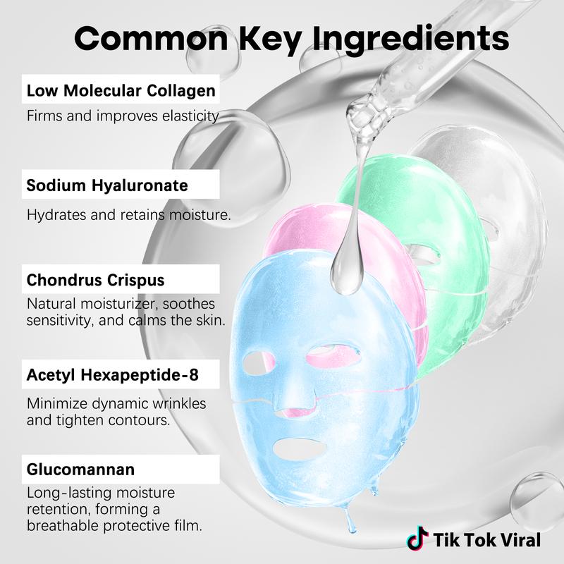 Deep hydration: rich in collagen and a variety of extracts, the mask material is made of hydrocolloid technology, easy to apply and quickly moisturize the skin, provide deep hydration effect, improve roughness and dryness of the skin, so that the skin is more hydrated and full.