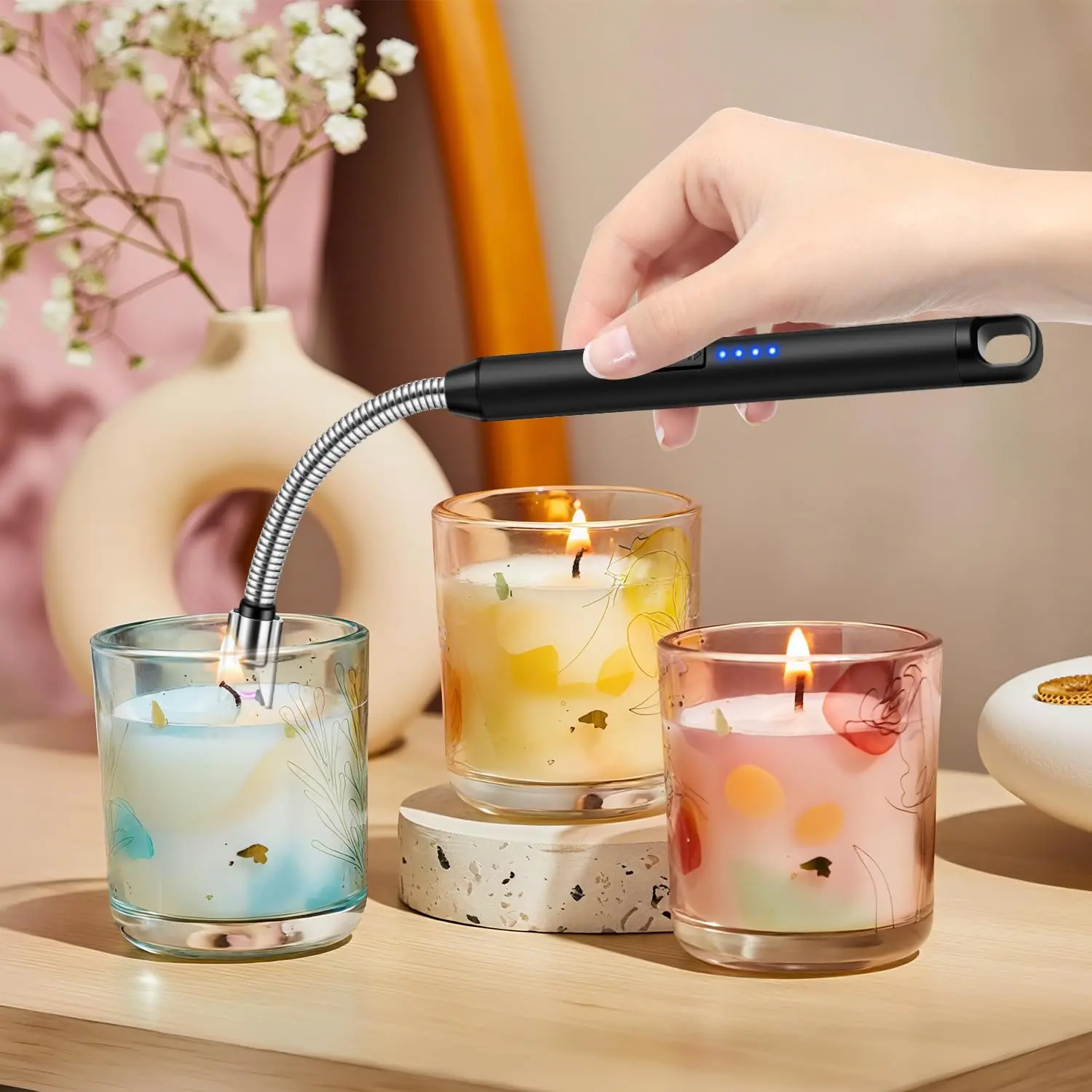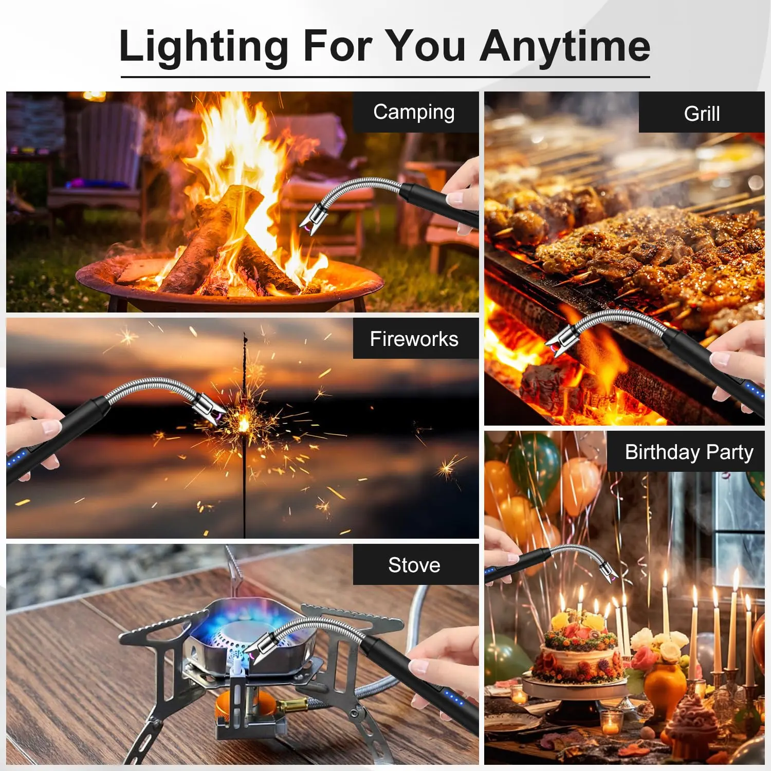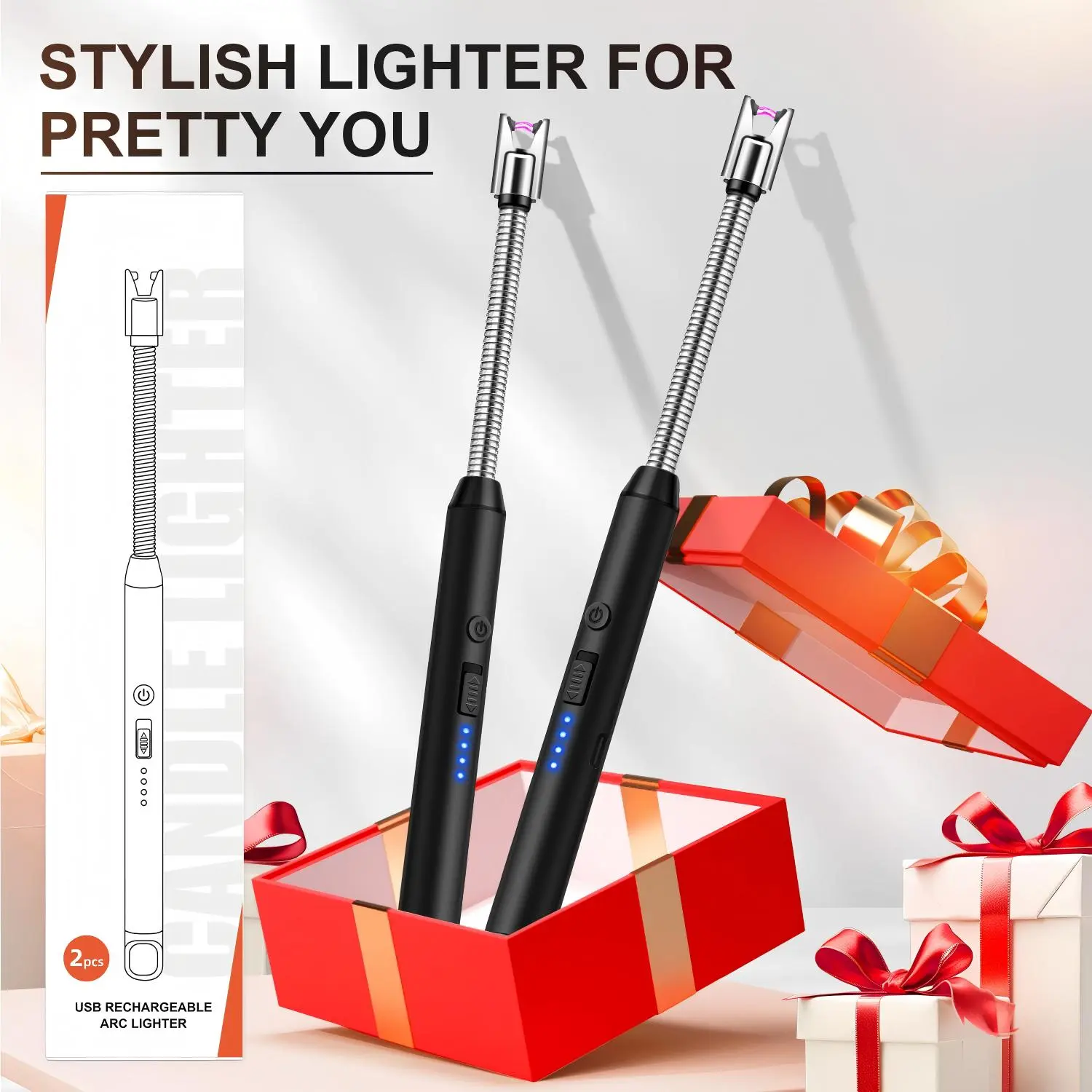ISUNMEA 2 Pack Candle Lighter is windproof and USB rechargeable. It features a 360° flexible neck for easy use. The safety lock ensures safe operation. Perfect for candle, grill, BBQ, camping, and gas stoves. This flameless lighter matches various needs.