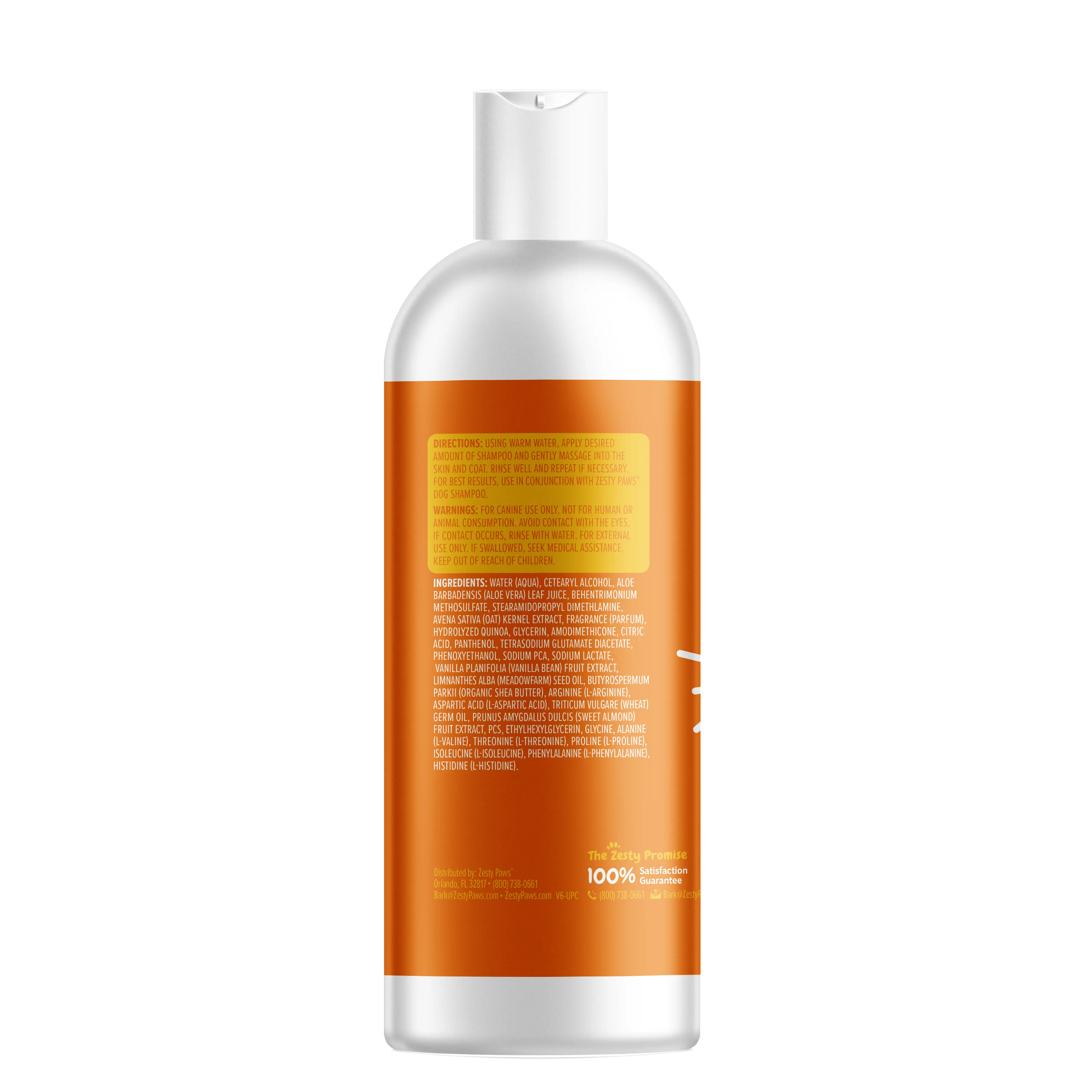 ·Zesty Paws Dog Conditioner is a bath wash with Oatmeal, Shea Butter, and Aloe Vera, to help condition and detangle dog fur, while also supporting their skin health.