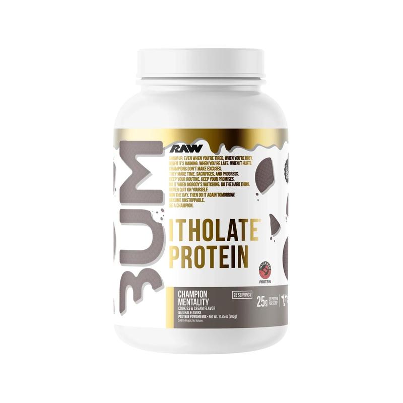 CBUM Protein - Itholate Protein Looking for a high-quality protein powder to maximize your workout potential? Look no further than Chris Bumstead's CBUM Series Itholate Protein from Raw Nutrition. With 25g of 100% micro-filtered whey protein isolate per scoop. This protein was personally formulated and flavored by Chris Bumstead so your post workout routine could be as Thavage as possible. CBUM ISO Protein is 100% micro-filtered whey isolate that packs 25g of the highest quality protein per scoop to make this protein the best choice you can make no matter what your fitness goals are. The CBUM Series Itholate comes in two incredible new flavors - Vanilla Oatmeal Cookie and Cinnamon Crunch Cereal.What is Isolate Protein?Don't let the funny name, Itholate, trick you, CBUM Itholate is made with whey isolate, a fast-digesting protein that's low in fat and carbohydrates. Our micro-filtered isolate powder contains 90% or more protein by weight, ensuring you get the most bang for your buck.Is Itholate protein vegan?Itholate Protein is not vegan. It is made from 100% micro-filtered whey protein isolate, which is derived from cow's milk. Therefore, it is not suitable for those following a vegan or dairy-free diet.What are the Benefits of Chris Bumstead's Isolate?This protein powder is personally formulated and flavored by Chris Bumstead himself, so you know you're getting the highest quality product on the market. Each scoop contains 25g of protein. Plus, with four delicious flavors to choose from - Vanilla Oatmeal Cookie, Birthday Cake, Cinnamon Crunch Cereal, and Mint Chip Ice Cream - you'll never get bored.CBUM Protein Nutrition FactsEach serving of CBUM Series Itholate Protein Content consists of one measuring scoop (31g) mixed with water, contains 110 calories, 2g of total carbohydrates (1% of daily value), 1g of total sugar, and 25g of protein (50% of daily value). Additionally, each serving provides 127mg of calcium (10% of daily value), 180mg of sodium (8% of daily value), and 161mg of potassium (3% of daily value). A single pack of CBUM Series Itholate Protein Content contains 25 servings, with a total content of 775g. Please note that the daily value percentages are based on a 2000-calorie diet, and the daily value for total sugar has not been established.CBUM Itholate Protein Nutrition Facts*Content: 775g*Dosages per pack: 25*Dosage size: 1 measuring spoon (31g)*Nutritional value per serving (31g):*Calories: 110*Total carbohydrates: 2g (1% of daily value*)*Total sugar: 1g*Protein: 25g (50% of daily value*)*Calcium: 127mg (10% of daily value*)*Sodium: 180mg (8% of daily value*)*Potassium: 161mg (3% of daily value*)CBUM Itholate IngredientsWhey Protein Isolate, Natural Flavors, Salt (Sodium Chloride), Gum Compound (Guar Gum, Gum Acacia, Xanthan Gum), Cinnamon Bark Powder, Sucralose.Allergy information:Contains milk