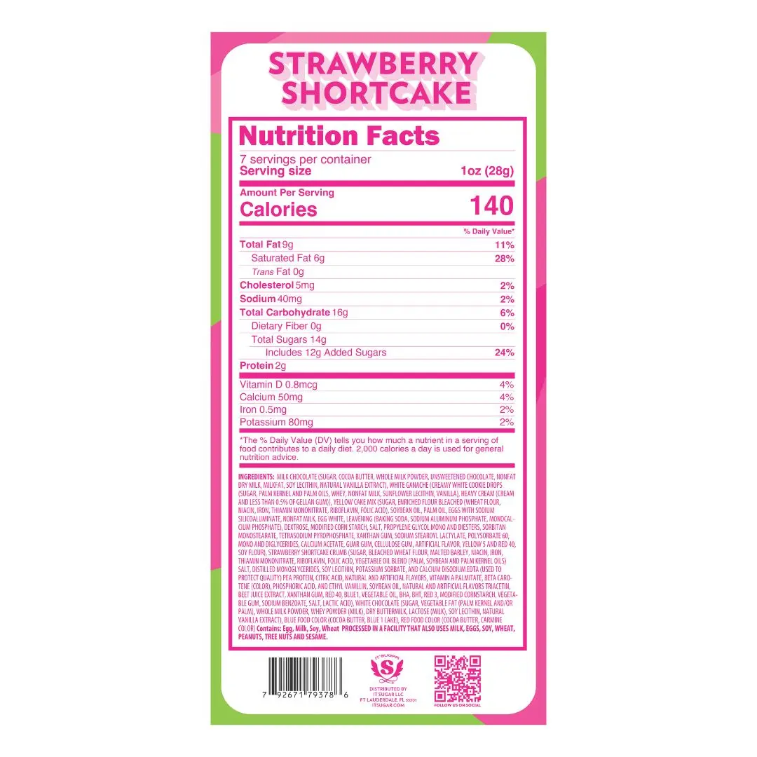 Get ready for a flavor-packed treat with the IT’SUGAR Strawberry Shortcake Milk Chocolate Bar — a 7oz bar of creamy milk chocolate infused with cake and strawberry crunchies, with a white chocolate ganache. Every bite is like a little celebration of berries, cake, and chocolate magic!