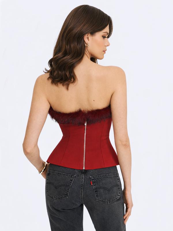 The Ivette Top is made for moments when the air turns crisp and the style stakes rise. Rendered in a rich crimson hue, this peplum beauty features a sculpted sweetheart neckline and a sleek, curve-hugging bodice that flares into a structured peplum for a flattering, waist-defining finish. Maroon fur trim speckled with black adds a plush seasonal contrast, while princess seams shape the silhouette to perfection. Finished with a back zipper and fully lined in satin for a smooth, luxurious feel, this top brings just the right blend of drama and warmth—ideal for art openings, festive dinners, or any night that calls for standout style.