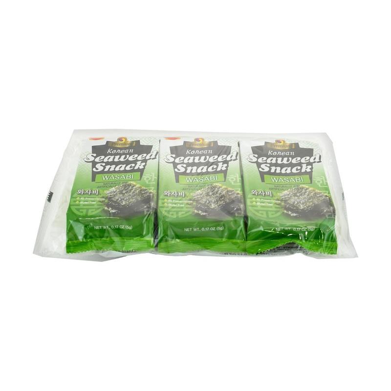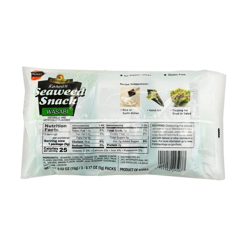 5. J-BASKET Korean Wasabi Seaweed Snacks - 3 Packs (15g Each) - Spicy & Savory Crispy Nori Chips