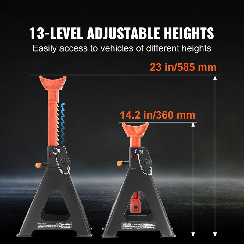 • For All Your Lifting Needs: Our 6-ton jack stands have a flexible range of 9-level adjustable heights, ranging from 14.2 inches (360 mm) to 23 inches (585 mm). All of your heavy projects will be within your limits! The wide lifting range meets your lifting needs, regardless of whether the underbody is low or high!