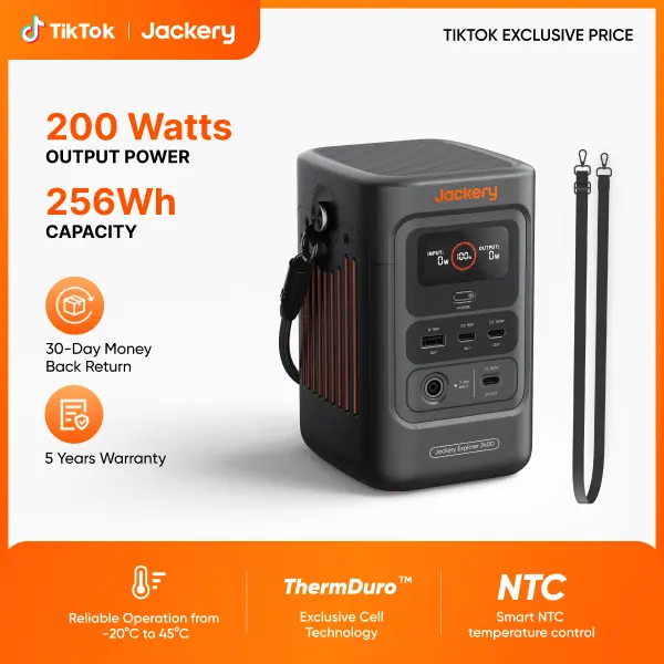The Jackery Explorer 240D delivers 256Wh of portable power in a compact design, providing energy comparable to multiple standard power banks. With four output ports (3×USB-C and 1×USB-A), it can charge up to four devices simultaneously. Featuring a 200W pure DC output with up to 140W per port, it supports a wide range of devices for outdoor activities and everyday use.