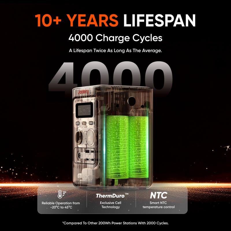 Built to Last: Featuring an upgraded LiFePO4 battery with a 10-year lifespan, the Explorer 240D maintains ≥70% capacity even after 6,000 charge cycles and operates in temperatures from -4℉ to 113℉, delivering dependable performance for years to come.