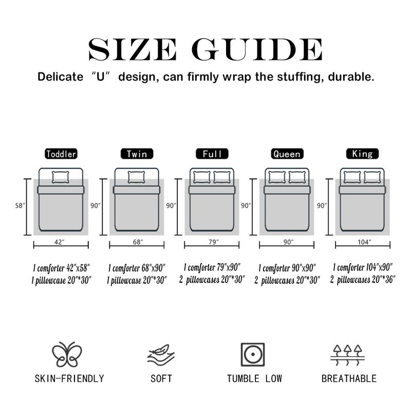 Size: Toddler size includes 1 comforter 42"x58", 1 pillowcase 20"x30";Twin size includes 1 comforter 68"x90", 1 pillowcase 20"x30"; full size includes 1 comforter 79"x90", 2 pillowcases 20"x30"; queen size includes 1 comforter 90"x90", 2 pillowcase 20"x30"; king size includes 1 comforter 104"x90", 2 pillowcase 20"x36"