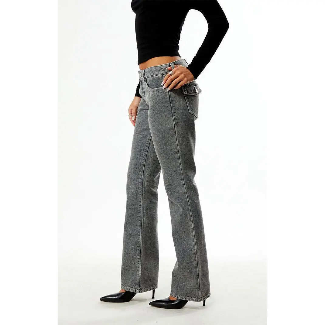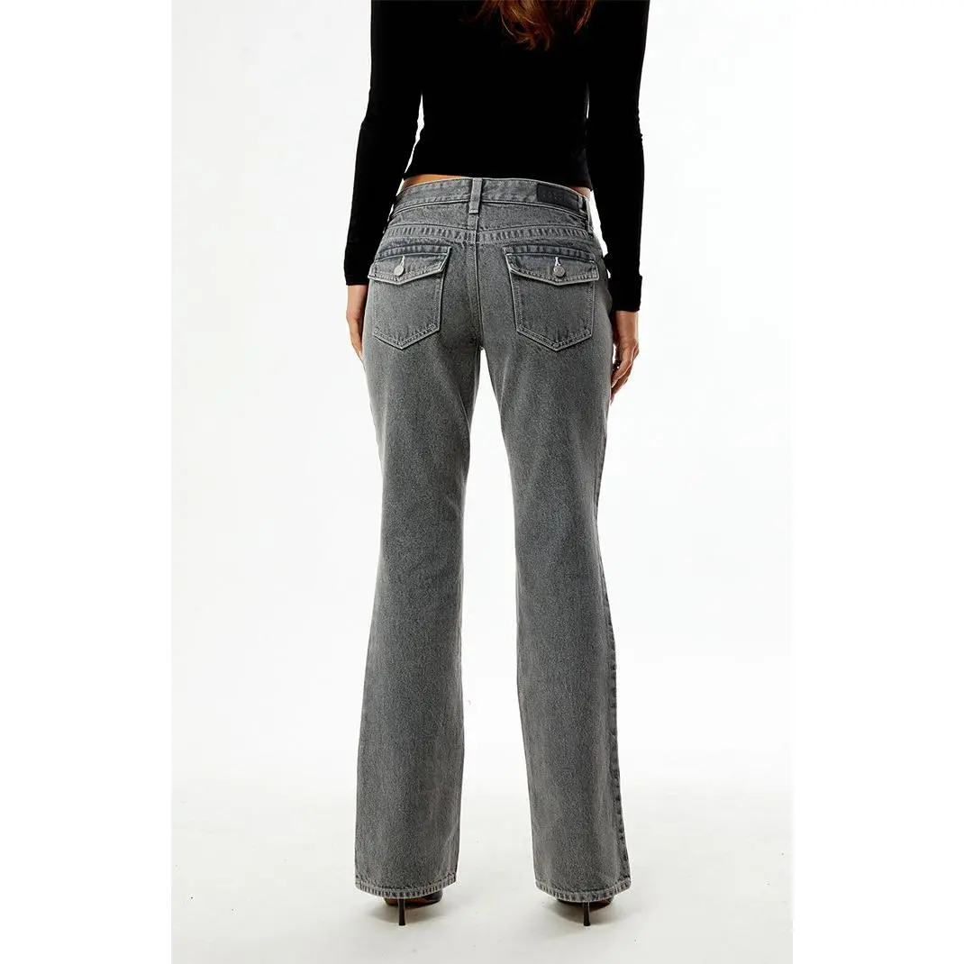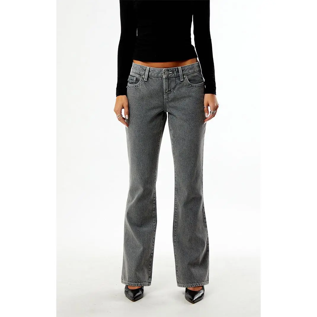 The Jade Low Rise Bootcut Jeans Button Pocket Gray from Pacsun deliver a comfortable, figure-flattering fit with sustainable style. Made from rigid, sustainably sourced cotton in a gray wash, they feature contrast stitching, button-flap back pockets, a low-rise waist, and lengthening bootcut legs for an easygoing look.