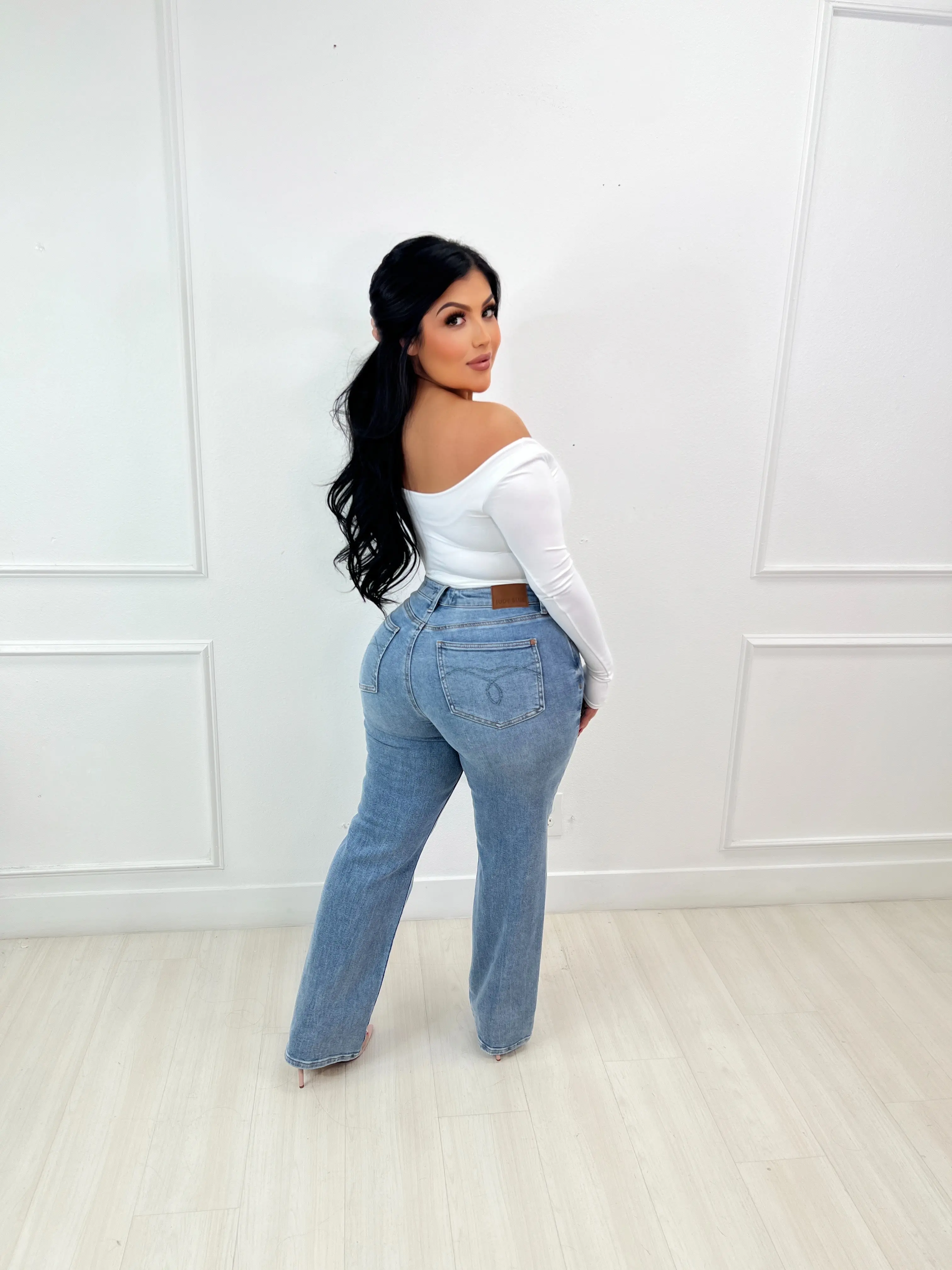 Fits perfectly. I did size down 2 sizes for a snatch look. I love it. My belly is flat but my behind looks peachy 🥰. So comfortable. True jeans without the heaviness of other jeans. Love the straight leg which are hard to find instead of wide legs. Must buy Judy Blue if you never had