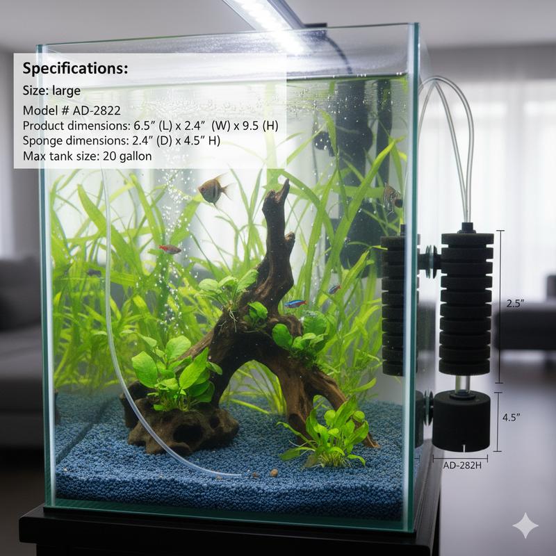 ✨ Large Double-Head Bio-Sponge Filters for 20-gallon tanks. These filters offer mechanical and biological filtration. Install an airline for aeration and filtration. Aerobic bacteria colonize the sponge, facilitating the nitrogen cycle. The sponge traps larger waste particles, cleaning water without trapping baby fish.