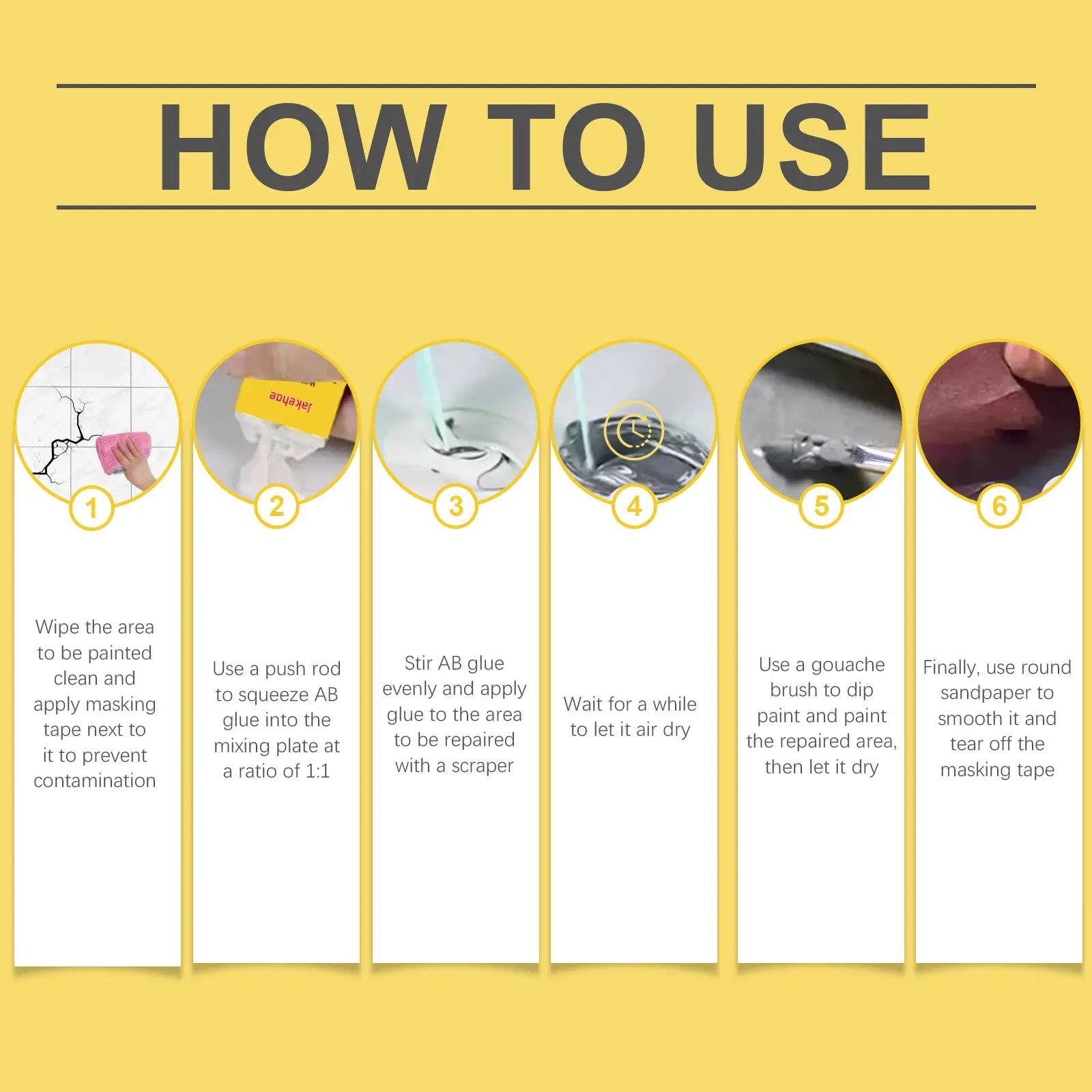 Our ceramic tile crack repair adhesive contains epoxy resin and calcium carbonate. It can quickly repair cracks and store beauty; Strong bonding, durable; Simple and easy to complete. Its use method is very simple: 1. Wipe the area to be painted clean, and apply masking tape next to it to prevent pollution; 2. Push the AB glue into the mixing plate at a ratio of 1:1 with a push rod; 3. Stir the AB glue evenly, and apply the glue to the place that needs to be repaired with a scraper; 4. Let it air dry for a while; 5. Paint the repaired area with chalk and let it dry; 6. Finally, smooth it down with round sandpaper and peel off the tape. Beautiful decoration, increase the beauty of the home. Excellent wear resistance to reduce wear and protect tiles.