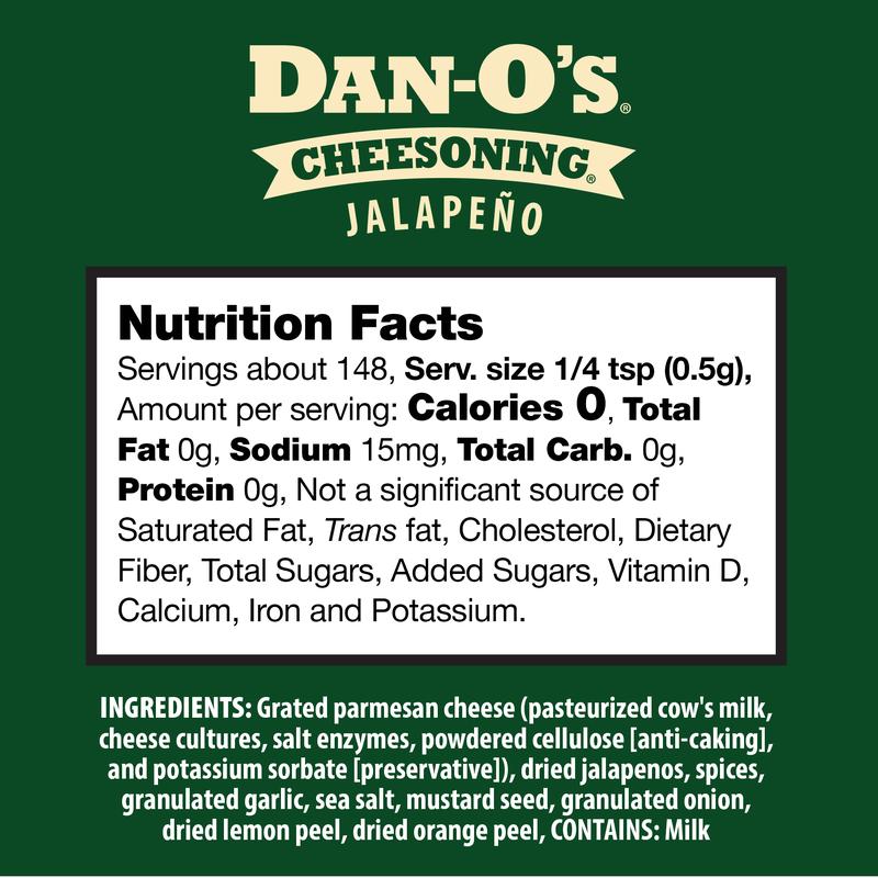 ·All-Purpose Seasoning: Just like Dan-O’s Original, you can use Jalapeño Cheesoning® all-purpose seasoning on Dan near anything from breakfast to dinner. Try it on popcorn, pizza, burgers, veggies...anything you want to get cheesy with. You Don’t Know Till You Dan-O®