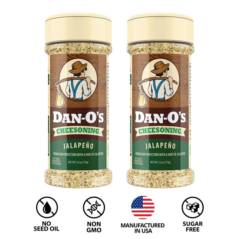 Jalapeño Cheesoning®?! You’re Dan right we went there. Dan-O’s Jalapeño Cheesoning® takes flavor to a whole new level of Dan-O-Myte®! Jalapeño Cheesoning® is an irresistible blend that combines the Italian herbs and spices and rich Parmesan cheese with the bold flavor of jalapeños, delivering the perfect balance of cheesy goodness and spicy heat. Sprinkle Generously® on any dish to infuse it with a burst of zesty kick and cheesy yumminess. Yum Yum Get Ya Sum!®