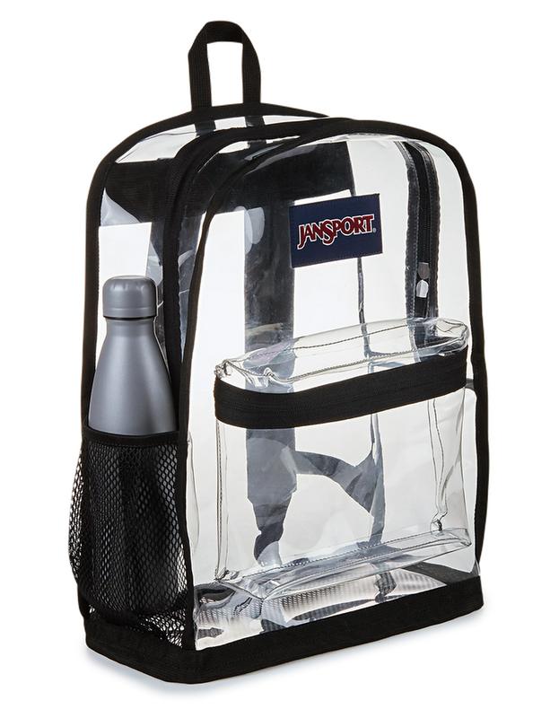 JanSport Clear Pack Backpack. Say hello to Clear Pack, the biggest bag in the Clear collection. Keep your supplies in the large main compartment and store your beverage in the side H2O pocket. You'll love the padded straps for longer adventures. Imported. Product Features:•One large main compartment•Side water bottle pocket•Abrasion resistant mesh bottom panel•Front zippered pocket •Adjustable padded and reinforced shoulder straps•Reinforced haul handle •External binding for extra reinforcement Content & Dimensions:•17.3" x 12.2" x 5.5". Capacity: 25.5 L. •30% Recycled Main Body Material