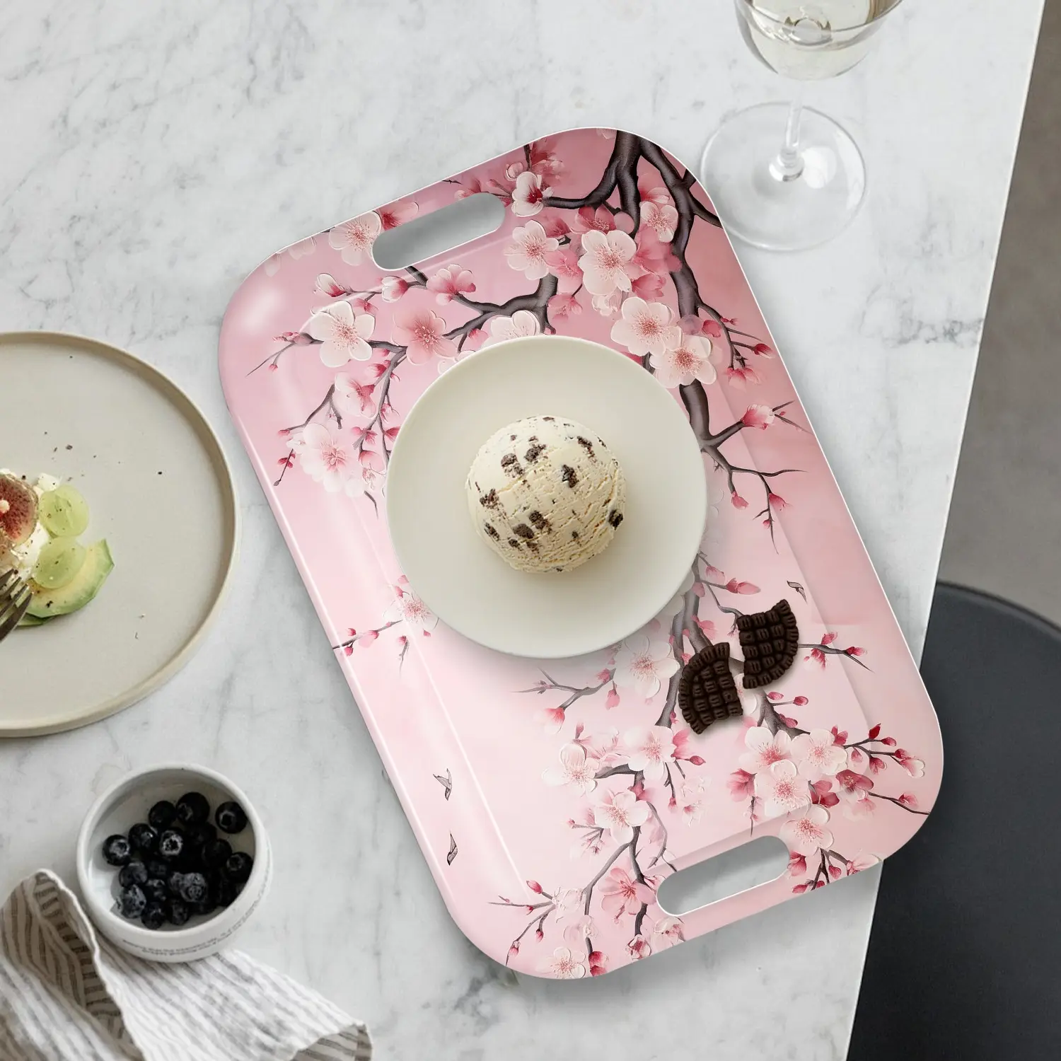 Japanese-Inspired Rectangular Serving Tray - Lightweight & Easy-Clean Table Tray with Handles, Elegant Pink Cherry Blossom Floral design for Dining, Living Room, Parties - Durable Melamine Decorative Platter, Home Entertaining, Contemporary Home Decor, S