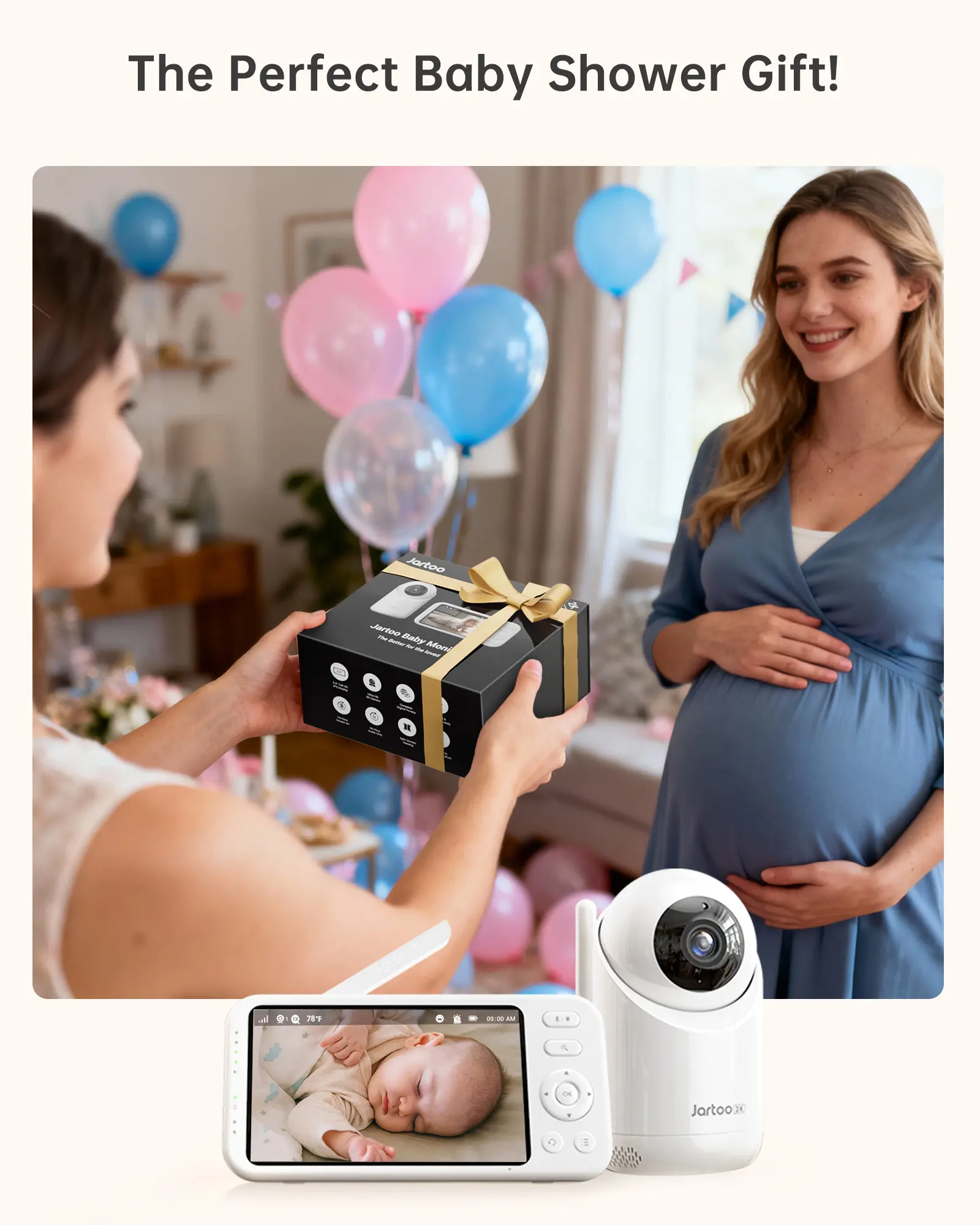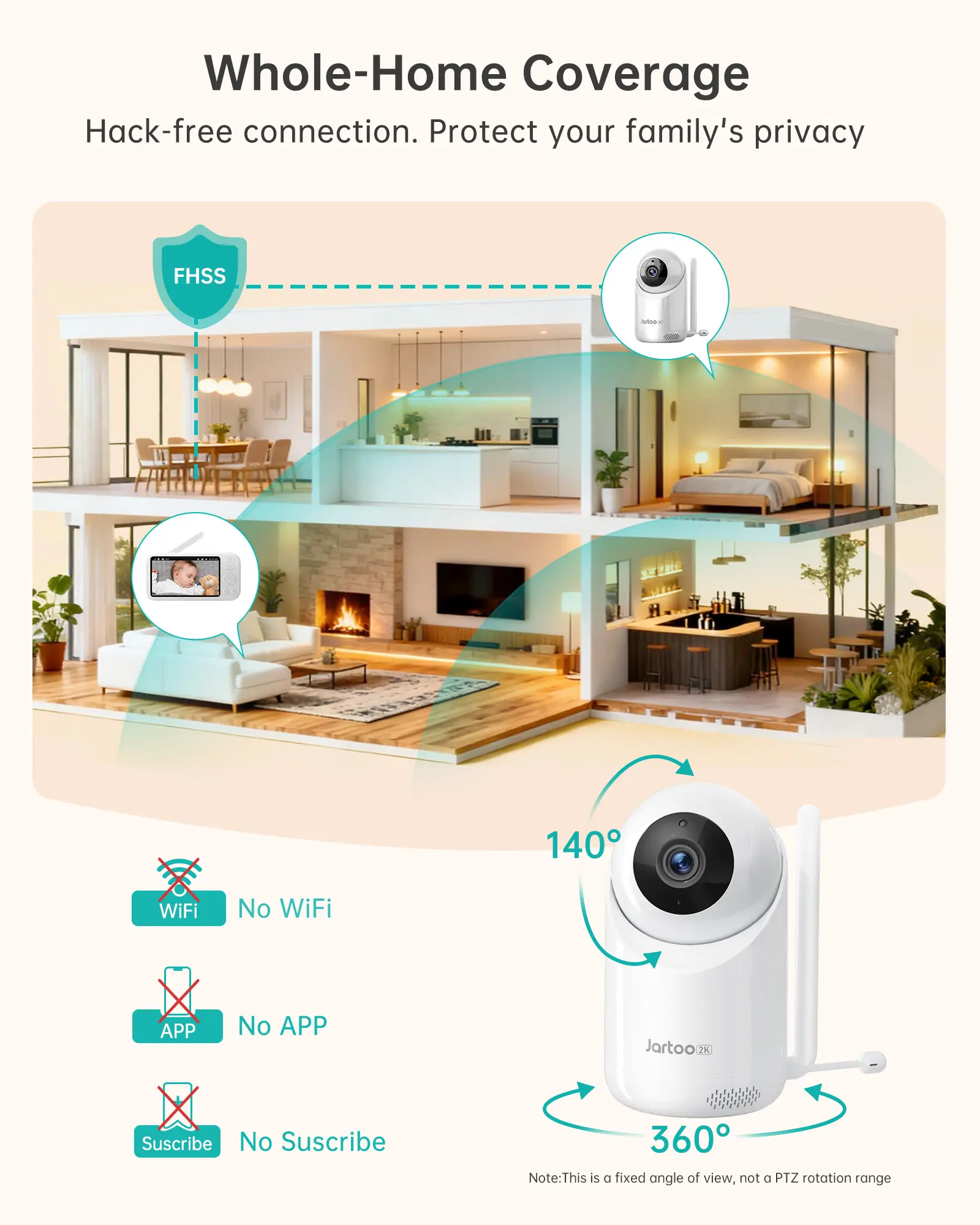 [Long-Range & No WiFi Needed] Stay connected to your baby anywhere at home—from the kitchen to the backyard—without relying on your internet. The Jartoo monitor operates on a private, secure connection, so it can’t be hacked and won’t drop when your WiFi does. Enjoy a stable, crystal-clear feed even in areas with weak signals, giving you true peace of mind.