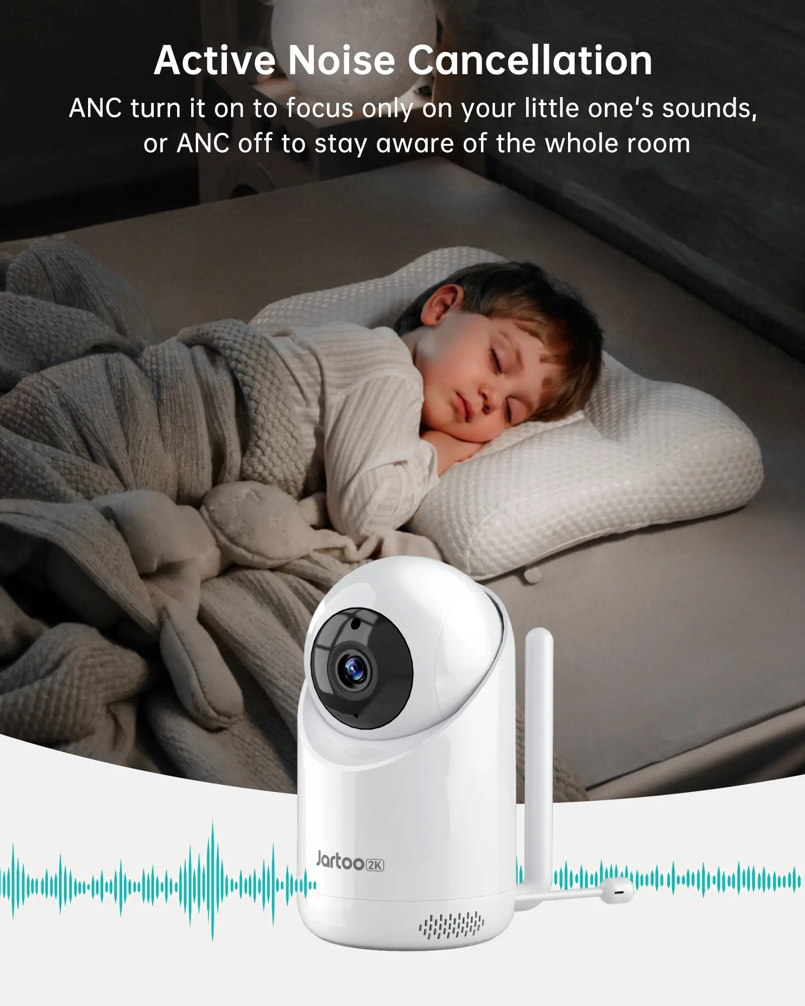 [AI Cry Detection & ANC] The Jartoo monitor’s advanced AI cry-detection alerts you the moment your baby cries, so you can respond quickly. It also features adjustable ANC—turn it on to focus only on your little one’s sounds, or off to stay aware of the whole room. Rest easier knowing you won’t miss what matters, whether you’re in the kitchen, yard, or living room.