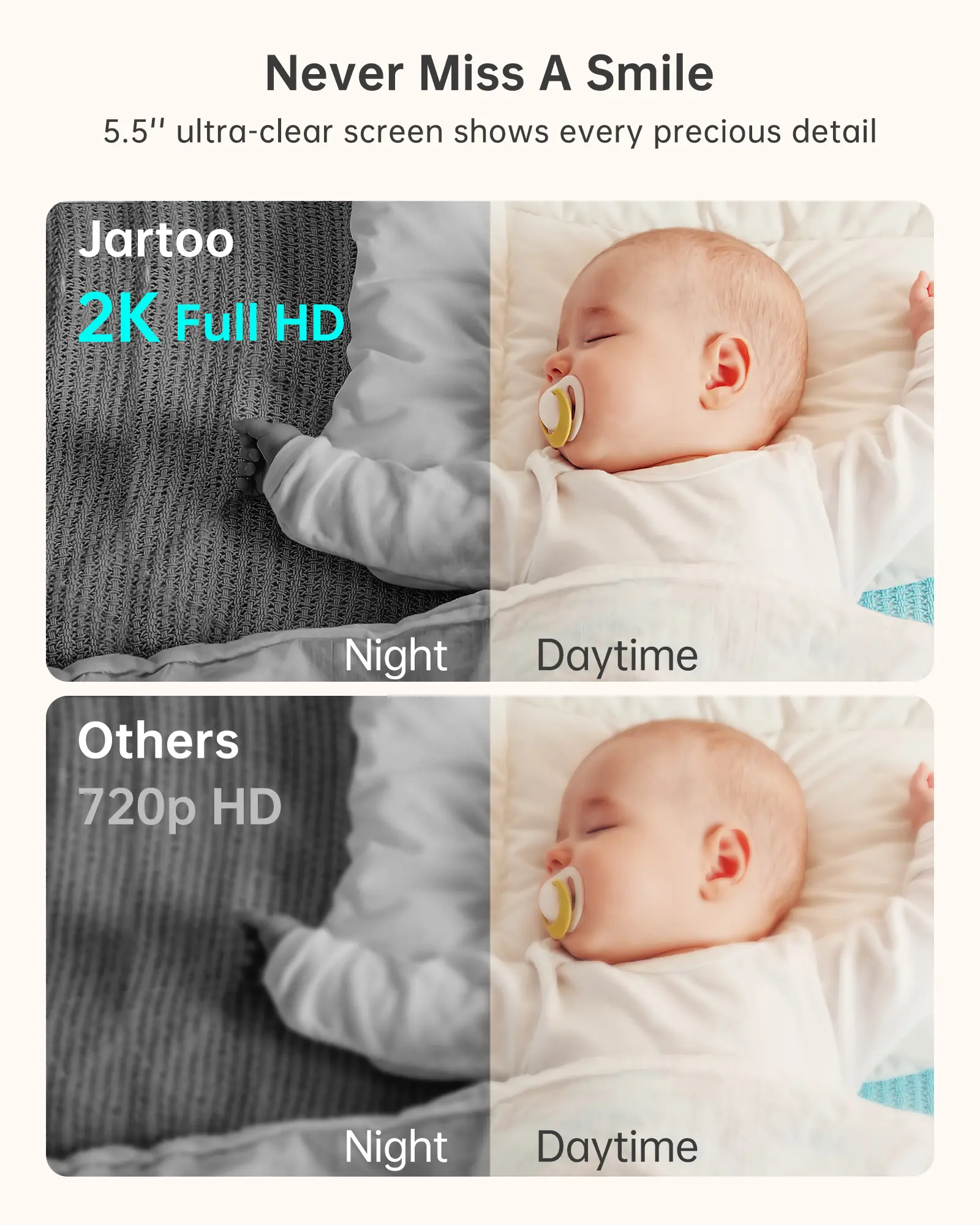 [Never Miss a Detail with 2K Clarity] Watch over your little one on a vibrant 5.5" IPS display that's 4x sharper than standard baby monitors. Smoothly pan 360° and tilt 140° for a complete view of the room, and use 4x zoom to see tiny features like a fluttering eyelash. With our enhanced night vision, experience the same crystal-clear clarity in total darkness, all without disturbing your baby's sleep.