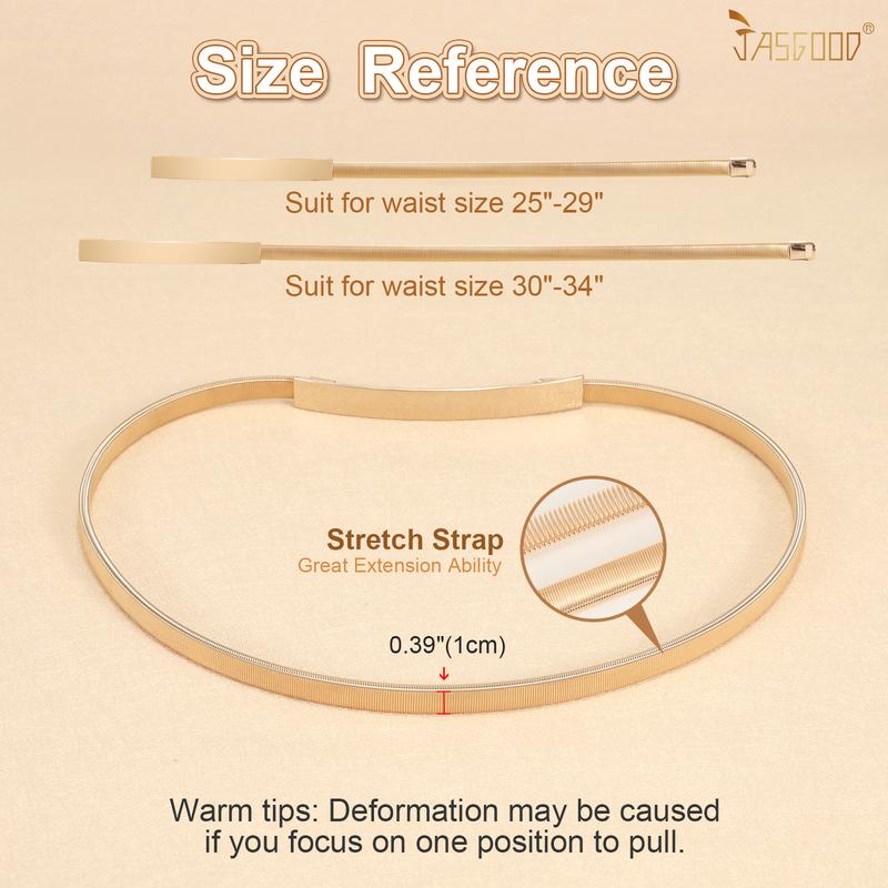 ·GOLD METAL WAIST BELT --- These gold belts are made of metal clasps and elastic metal spring waistband with slight weight. These stretchable metallic belts with smooth edges makes you feel more comfortable to wear on your waist. And the metal buckle can be hooked easily.