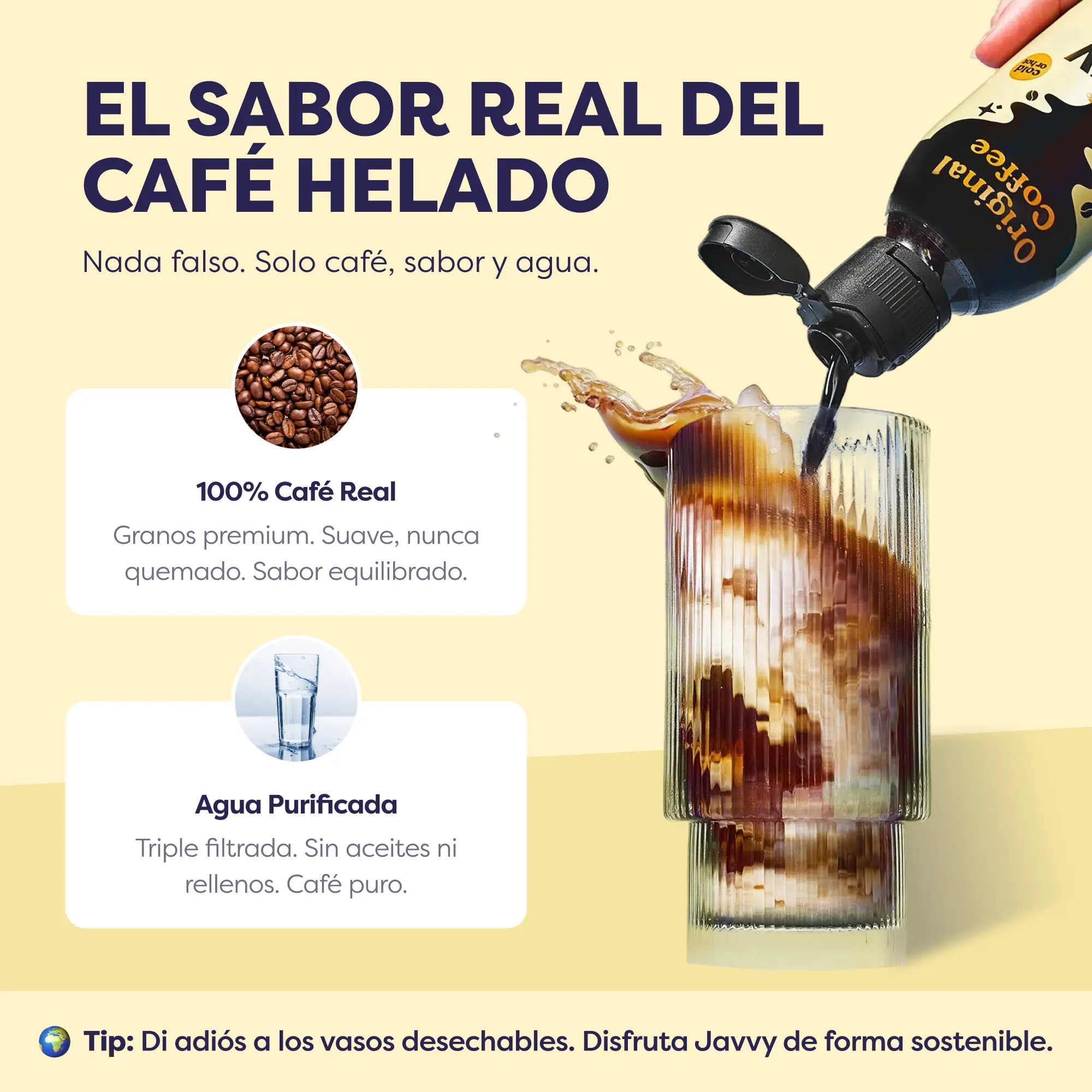 🌍 CONSCIENTE. ARTESANAL. REVITALIZANTE. – ¡Nuestro compromiso con la calidad es lo primero! El concentrado de café Javvy se elabora meticulosamente con agua ultrapura, los granos de arábica más frescos y extracto de cacao obtenido de manera responsable de pequeños agricultores dedicados. Nuestro proceso de elaboración es completamente libre de aditivos artificiales, garantizando una experiencia de café auténtica.