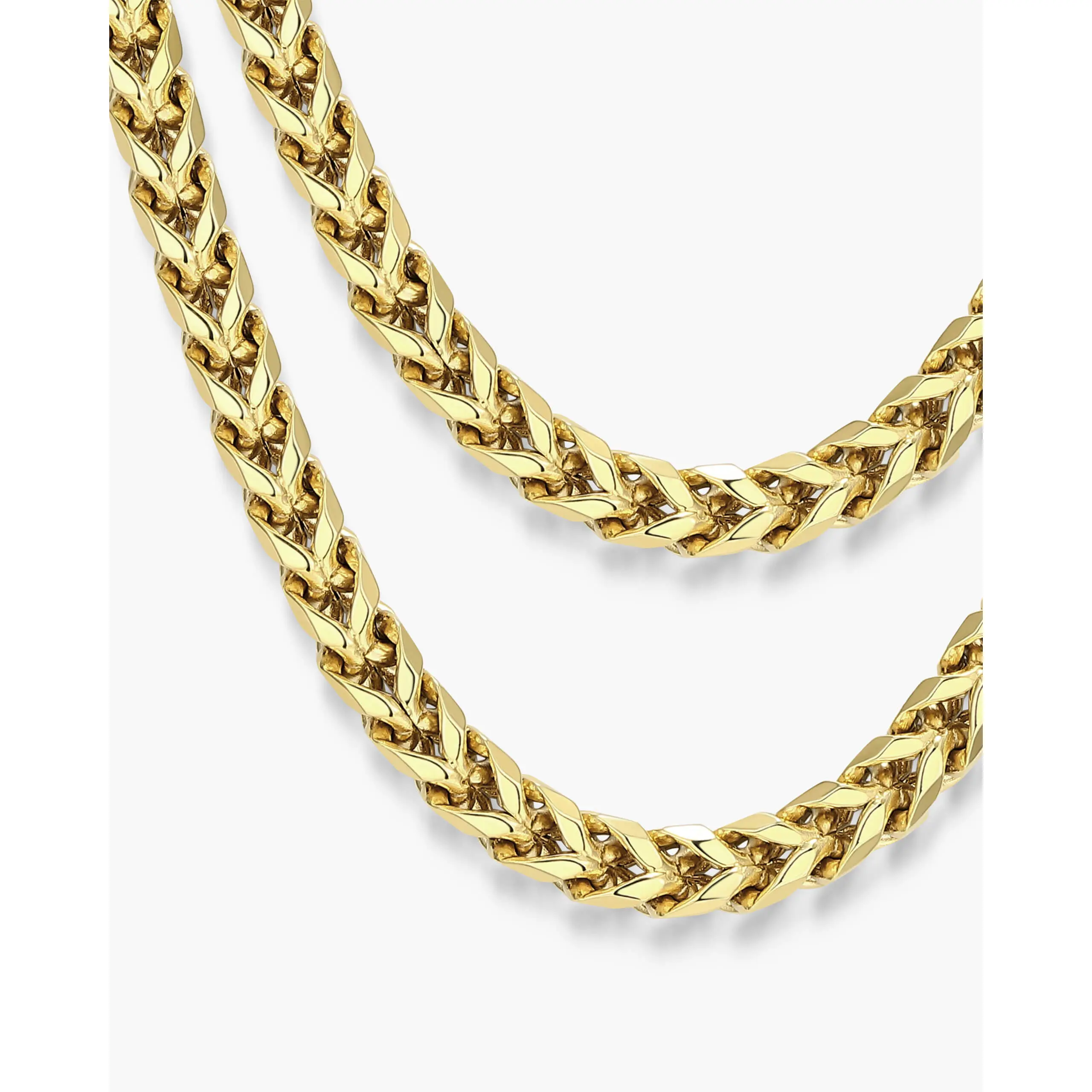 Modern shine meets classic design in the Franco Chain 5mm in gold. This chain features our new 5mm gauge for a bold, contemporary look. The sleek chevron-shaped links deliver lasting polish and durability.