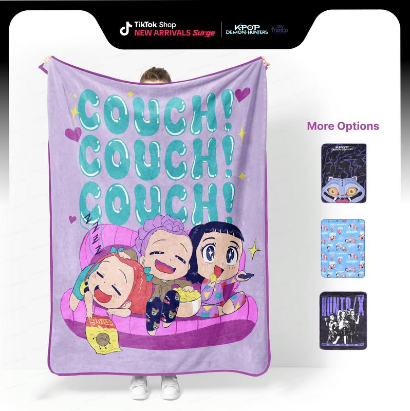 Get cozy with the KPOP Demon Hunters Couch! Couch! Couch! Throw Blanket, featuring Mira, Rumi, and Zoey in adorable chibi style lounging on a bright pink couch with snacks, popcorn, and cozy socks. Set against a soft lavender background with playful lettering that repeats “Couch! Couch! Couch!,” this blanket perfectly captures the fun, laid-back side of the Huntr/x trio. Measuring 60” x 46” and made from ultra-soft microfiber fleece, it offers plush comfort and lightweight warmth while doubling as a decorative accent for any room. Durable, machine washable, this fandom blanket is perfect for sleepovers, movie nights, dorm décor, or gifting to KPOP Demon Hunters fans of all ages.