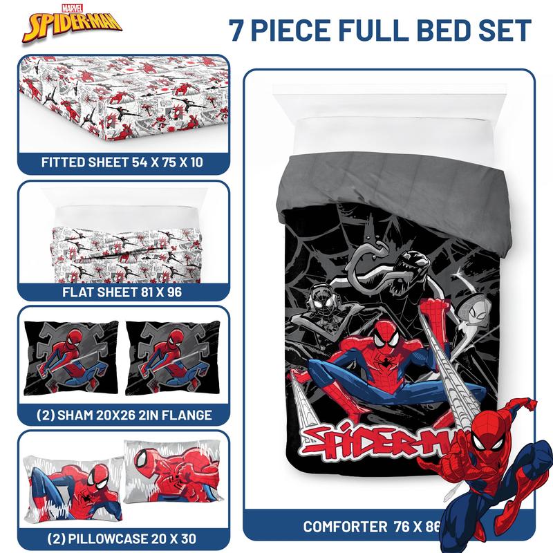 Transform your child's bedroom with our exciting 5-Piece Twin Bedding Set! This complete kids' bedding collection brings favorite characters to life, turning bedtime into an adventure. Our set includes a cozy comforter (64" x 86"), a fitted sheet with 10" deep pockets (39" x 75" x 10"), a flat sheet (66" x 96"), a decorative pillow sham (20" x 26"), and a standard pillowcase (20" x 30"). Each piece is designed to create a comfortable and stylish sleep environment for your little one. Crafted from premium 100% brushed microfiber polyester, this bedding set offers the perfect blend of softness and durability. The breathable fabric ensures a restful night's sleep, helping your child wake up refreshed and ready for new adventures. Featuring vibrant designs with your favorite Marvel characters, this set sparks imagination and adds a playful touch to any children's room decor. Your child will love snuggling up with their favorite friends every night. Parents will appreciate the easy-care nature of this set. It's machine washable and long lasting, keeping the colorful designs looking great wash after wash. Simply machine wash in cold water and tumble dry on low heat. Perfect for everyday use, sleepovers, or as a thoughtful gift for birthdays and holidays. Suitable for both boys and girls, this versatile bedding set is more than just bedding – it's a ticket to dreamland adventures! Give your child the gift of magical nights and restful sleep with our Spider-Man Twin Bedding Set. It's the ideal addition to any kid's room, combining comfort, style, and beloved characters in one fantastic package.