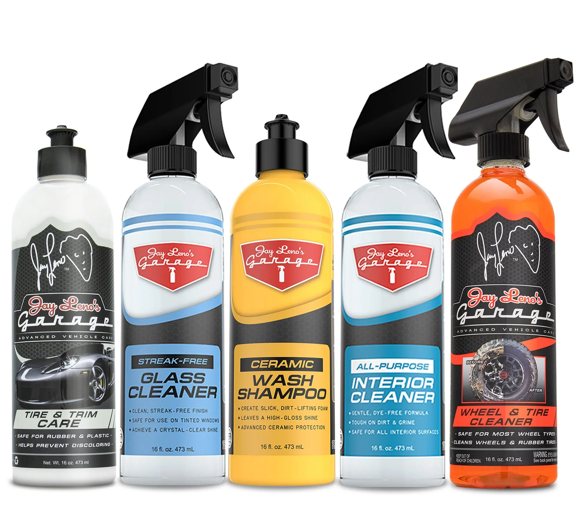 Introducing the 6 Piece Car Essentials Kit from Jay Leno's Garage This all-new 6 Piece Car Essentials Kit contains everything you need for the next wash on your car, truck, SUV or motorcycle. The kit contains: 1 - JLG 5 Gallon Bucket, 1 - 16 oz Ceramic Wash Shampoo, 1 - 16 oz Tire & Trim Care, 1 - 16 oz Wheel & Tire Cleaner, 1 - All Purpose Interior Cleaner and 1 - 16 oz Glass Cleaner. Makes a great gift for the car-person on your list.